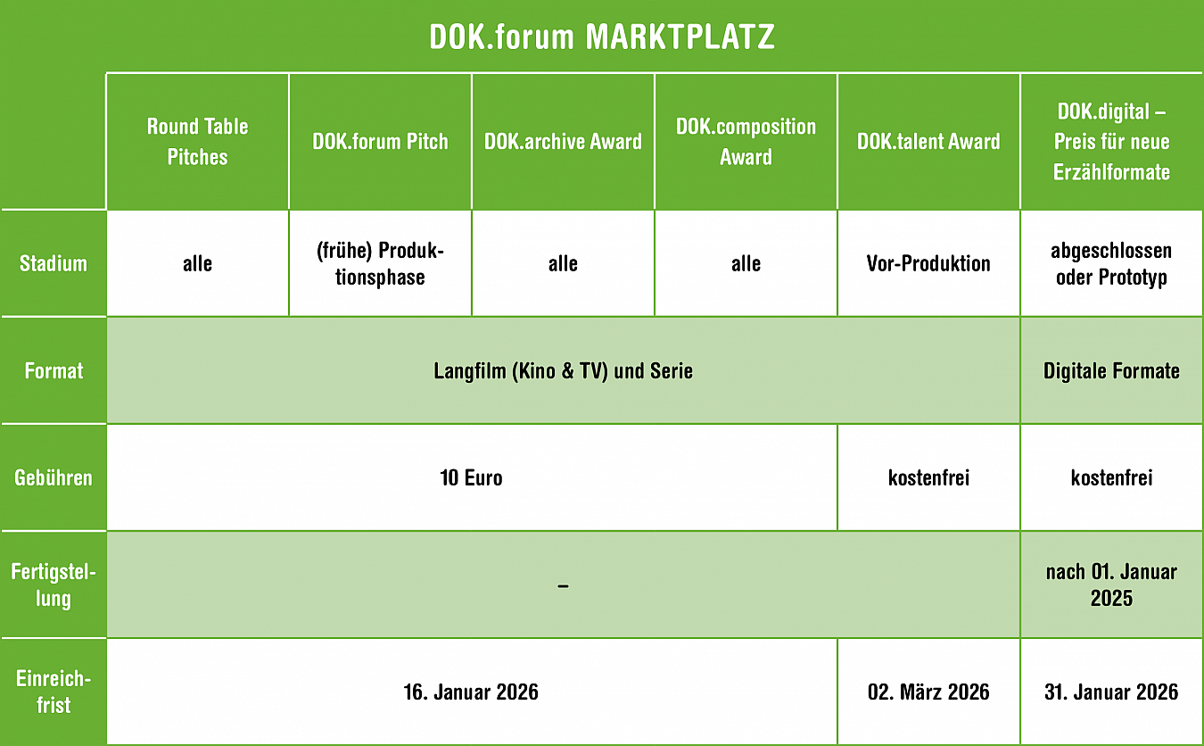 - DOK.composition Award, sponsored by Sonoton Music and Deutscher Komponist:innen Verband, endowed with 2,500 euros: projects in all stages of development by a production company from the German-speaking countries (DACH) with a solid compositional concept.