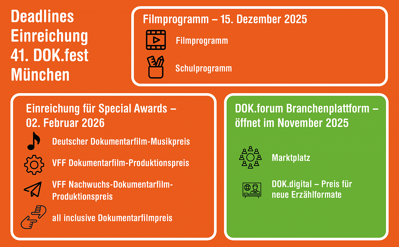 We are looking for stirring, moving, curious, impressive and relevant documentary films. From now on, filmmakers, producers, distributors and composers are cordially invited to submit their latest films for the various programme sections of DOK.fest München.