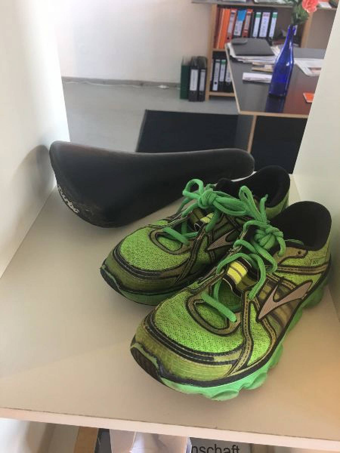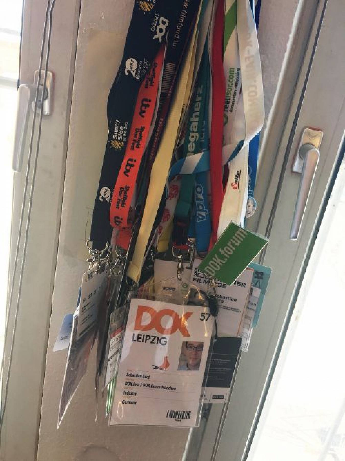 Um 10 Uhr begann wie jeden Montag der Jour fixe, in dem der Verlauf der letzten Woche reflektiert, die nächste Woche geplant und die derzeitige in den einzelnen Abteilungen besprochen wurde. Bei den Gesprächen in der großen Gruppe wurde mir klar, dass es sich hier nicht nur um Arbeitskollegen handelt, sondern um eine Familie, die durch ihre Leidenschaft für den Dokumentarfilm zusammengehalten wird. Das zeigte sich nicht nur durch den herzlichen Umgang miteinander, sondern auch durch den gegenseitigen Anteil der Mitarbeiter am Privatleben und an den vielen Insidern, die man als Außenstehende nicht mal ansatzweise versteht. Der Höhepunkt des Familiengeists zeigt sich eindeutig in Festivalleiter Daniel Sponsels Ecke: Da stehen wie in einer Ausstellung abgetragene Turnschuhe, die hauptsächlich von seinen sportbegeisterten Kindern stammen. Auch die anderen haben private Gegenstände im Büro.