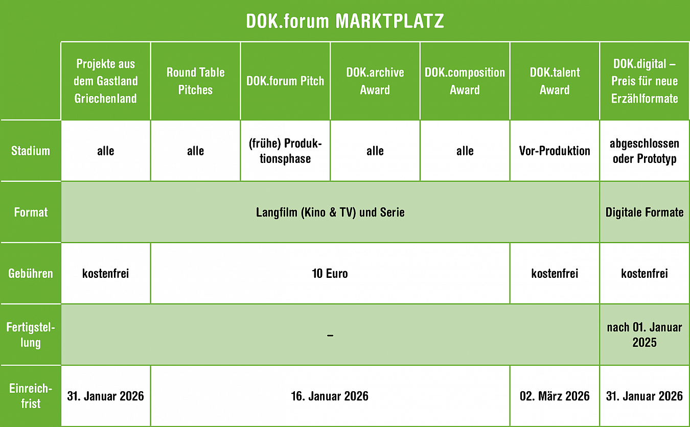 Marktplatz (alle Pitch-Formate und Wettbewerbe außer griechische Projekte, DOK.digital Award und DOK.talent Award): 16. Januar 2026