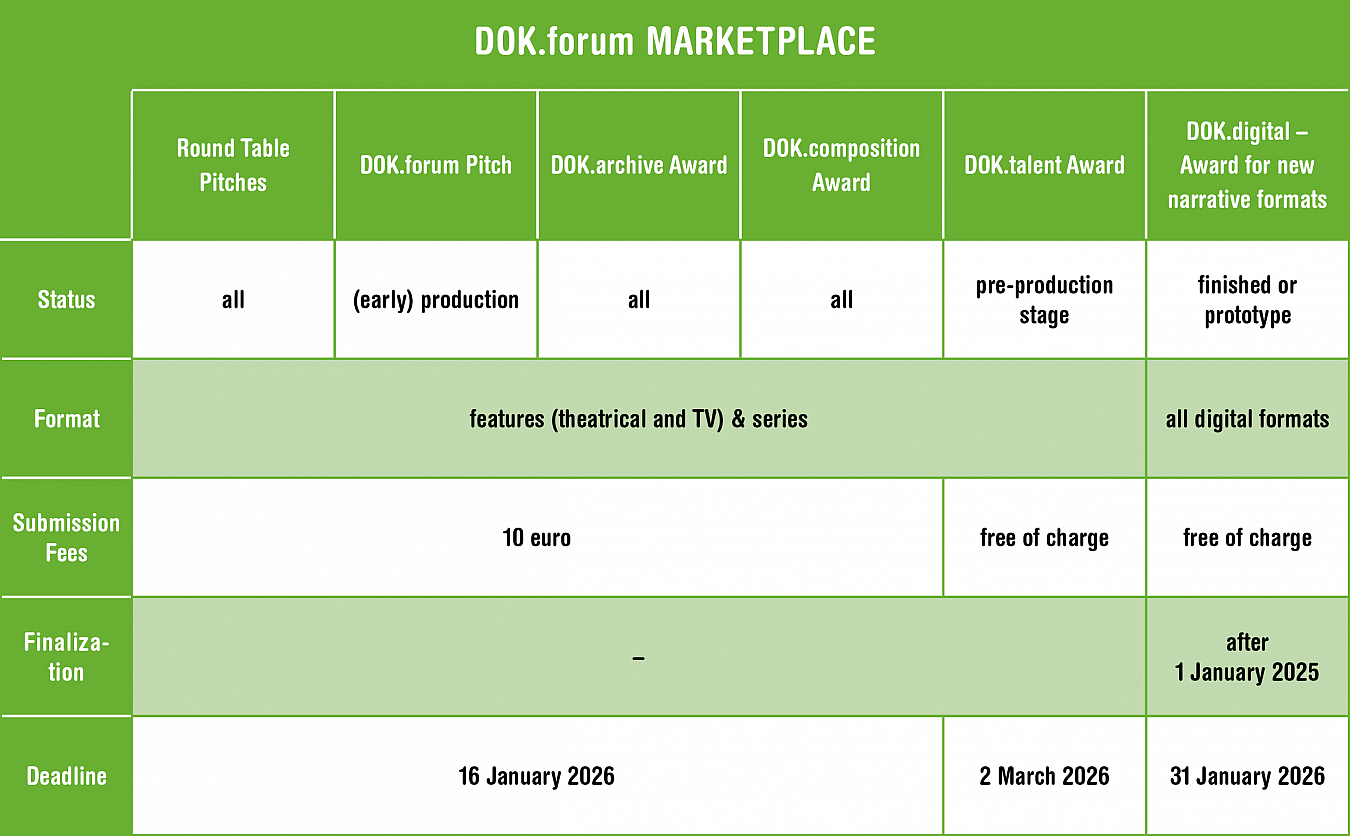 - DOK.composition Award, sponsored by Sonoton Music and Deutscher Komponist:innen Verband, endowed with 2,500 euros: projects in all stages of development by a production company from the German-speaking countries (DACH) with a solid compositional concept.