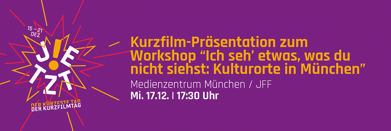 Im Rahmen der Aktionswoche zum Kurzfilmtag vom 15. bis 21. Dezember 2025 präsentieren wir die Filme bei einer gemeinsamen Veranstaltung auf der Leinwand. Familien und Freunde sowie die Personen der kooperierenden Drehorte und Fördereinrichtungen sind herzlich eingeladen am 17. Dezember 2025 um 17.30 Uhr ins Medienzentrum München in der Rupprechtstraße 29 zu kommen.
