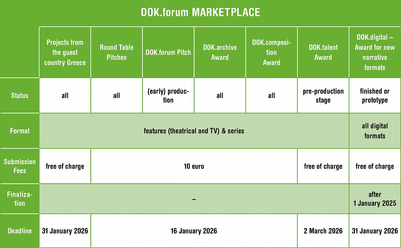 Marktplatz (alle Pitch-Formate und Wettbewerbe außer griechische Projekte, DOK.digital Award und DOK.talent Award): 16. Januar 2026
