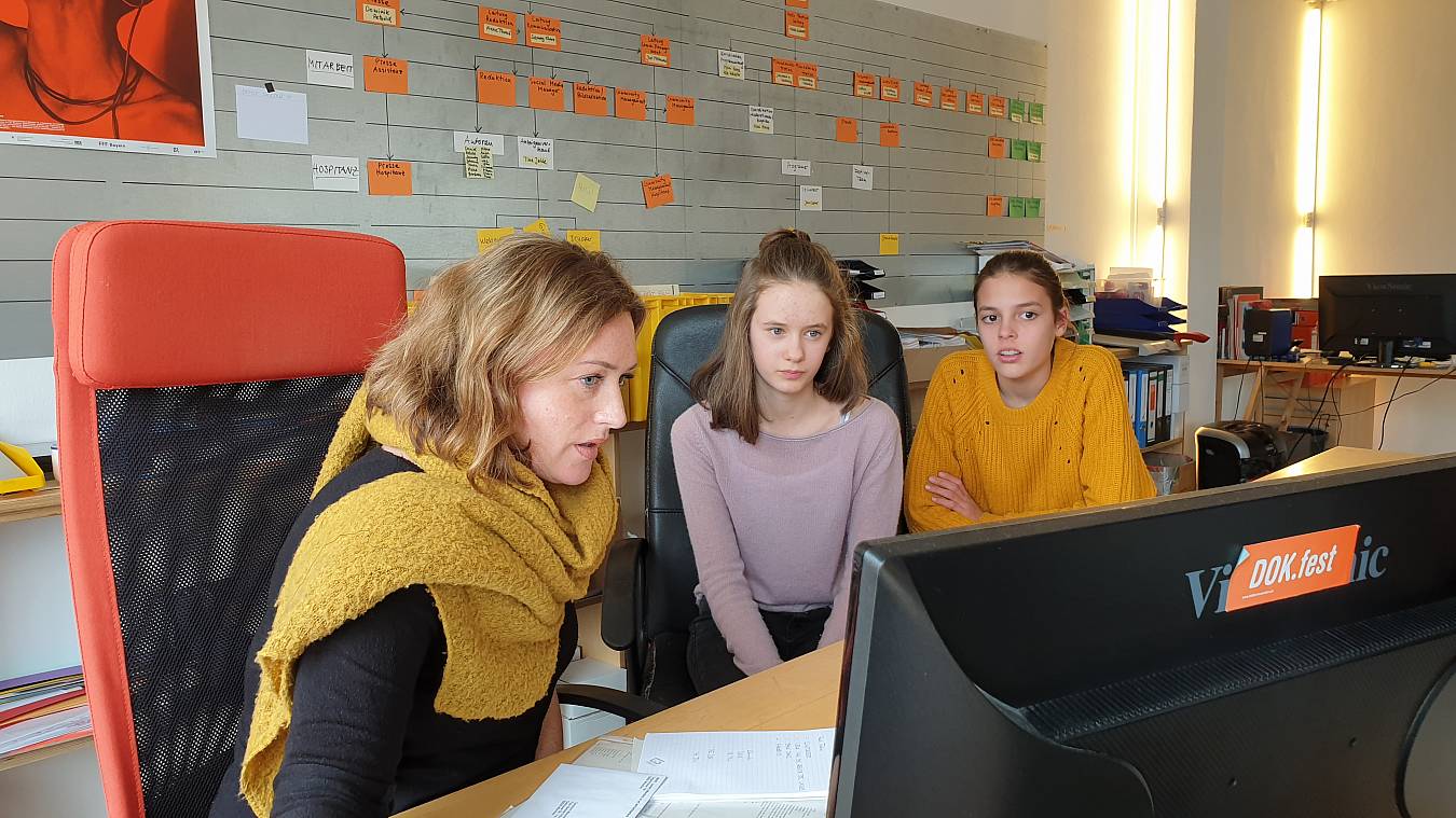 Die Workshop-Woche endete am Freitag mit einer großen Redaktionskonferenz, in der die Teilnehmer.innen die Texte und Layout der Beiträge in einem letzten Schritt finalisierten und gestalteten. Den Abschluss bildete ein Screening des Filmes LAS HERMANAS DE ROCINANTE von Alexandra Kaufmann, der im letztjährigen Programm des DOK.fest lief.
