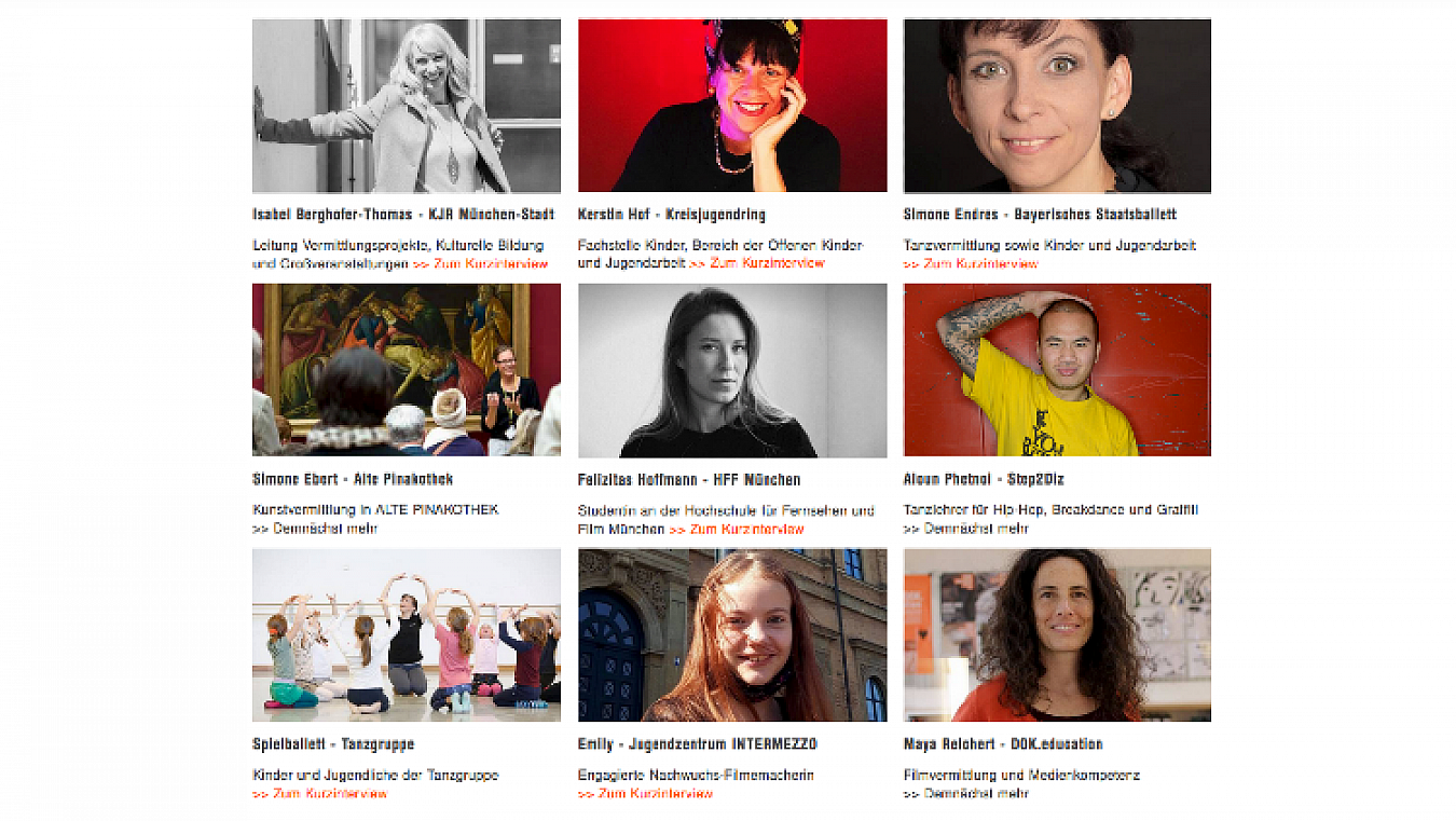 Isabel Berghofer-Thomas (Junge Kultur / KJR), Simone Ebert (Kunstvermittlung / Alte Pinakothek), Lisa Gottlieb (Junge Kultur / KJR), Sabine Hahn (Münchner Stadtbibliothek), Michaela Herrmann (Junge Kultur / KJR), Kerstin Hof (Fachstelle Kinder / KJR), Julia Kessler-Knopp (Bayerische Staatsoper), Celina Miehle (Junge Kultur / KJR), Maya Reichert (Filmbildung / DOK.fest München)