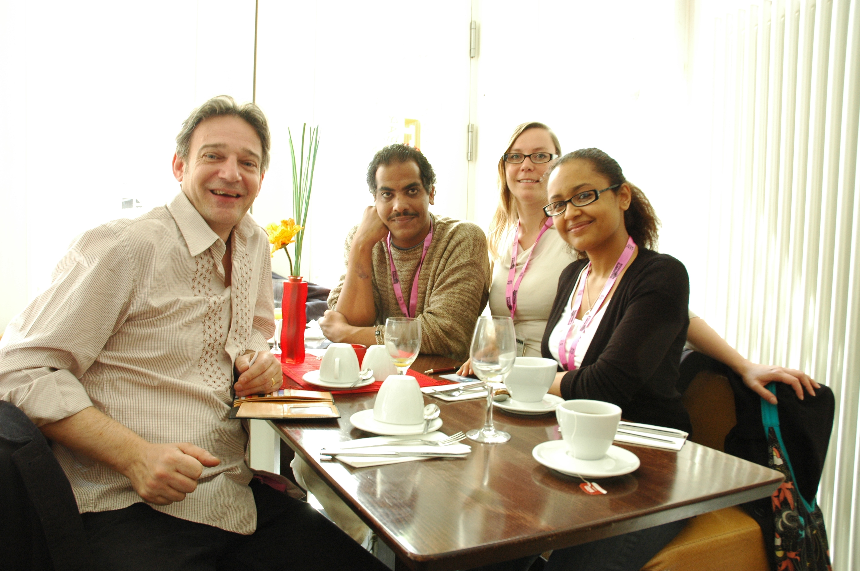 Julian Cole (Regisseur WITH GILBERT & GEORGE), Tital Afifi Mahmoud (Goethe-Institut Besucherprogramm), Kerstin Dibbelt (Goethe-Institut Besucherprogramm) und Issra El-Kogali (Goethe-Institut Besucherprogramm) / Copyright DOK.FEST-Maren Bornemann