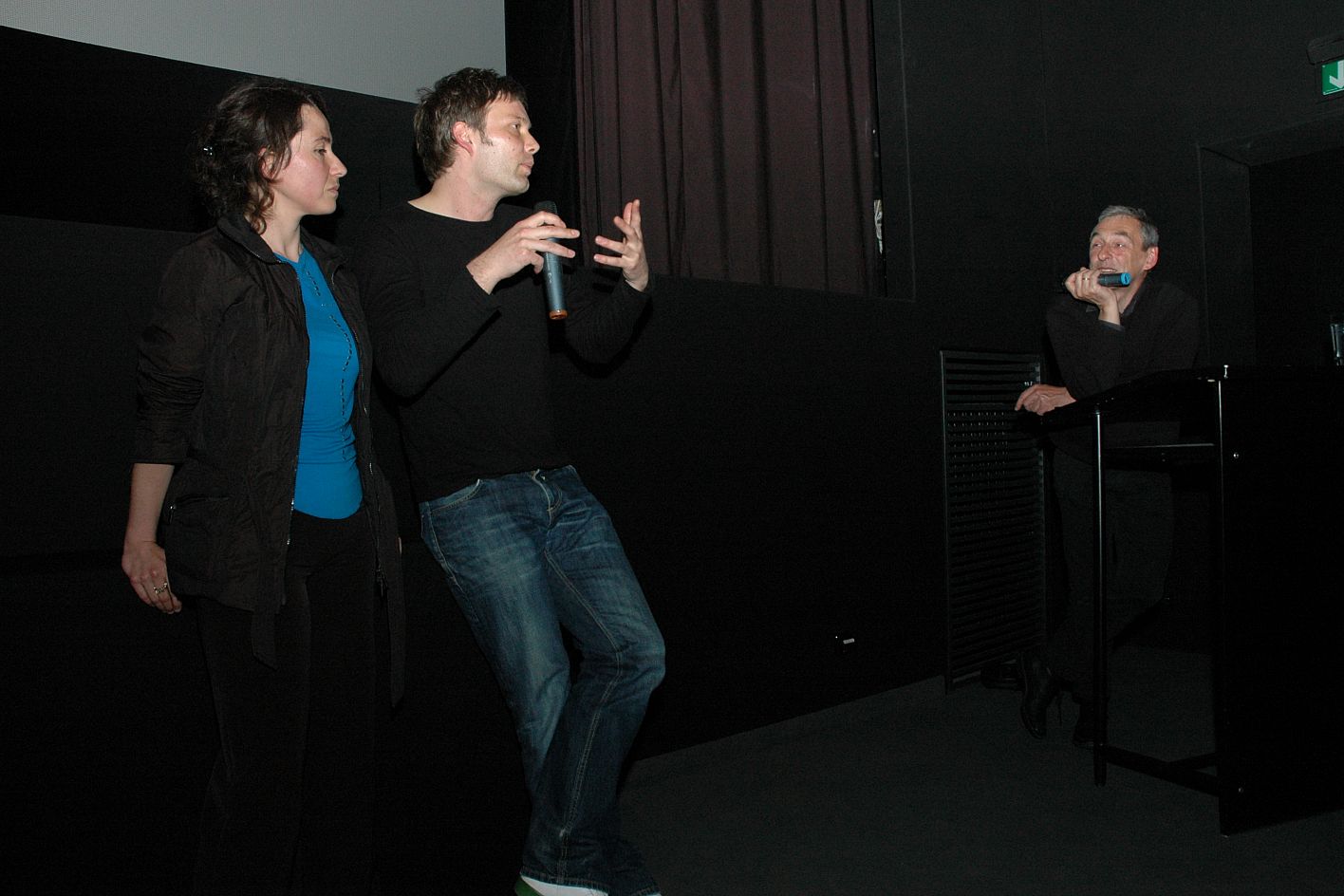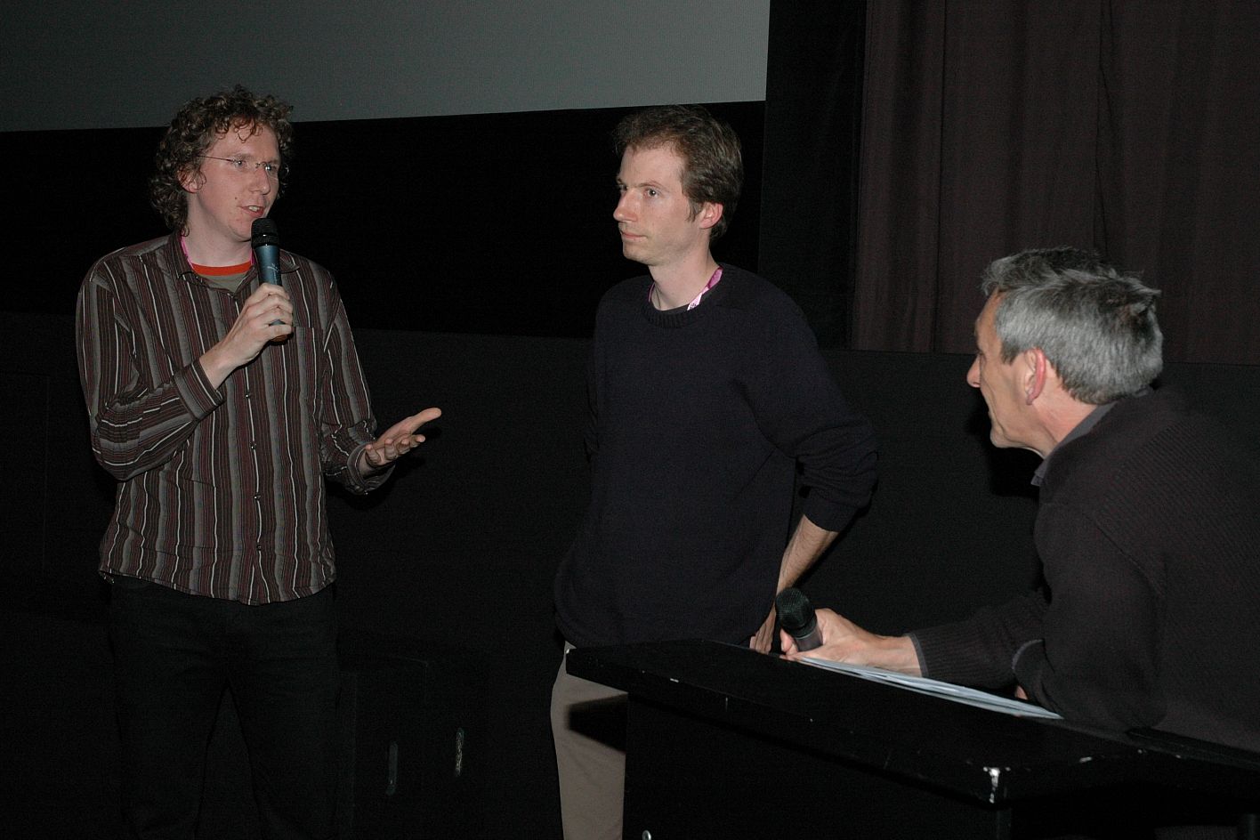 Martin Nudow und Thomas Beckmann (Regisseure O CASA APARTE) mit Moderator Roderich Fabian (Zündfunk)