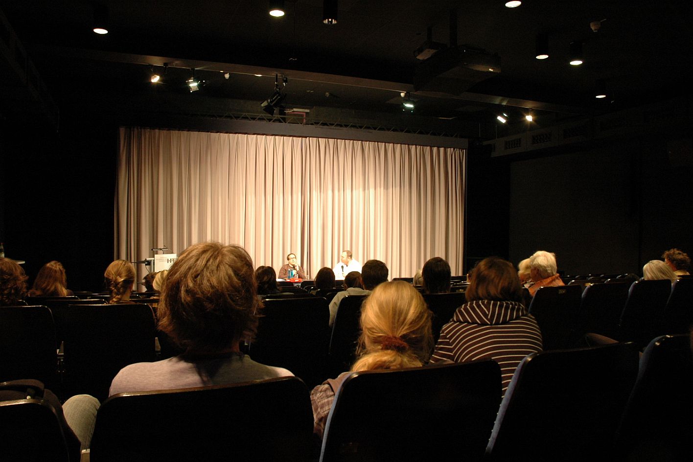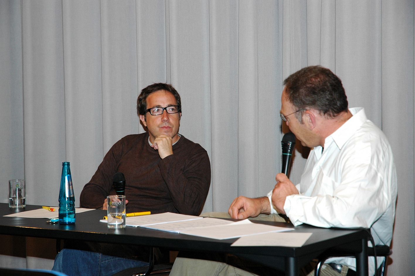 Werkstattgespräch in der Hochschule für Fernsehen und Film mit Yoav Shamir (Regisseur FLIPPING OUT) und Hermann Barth (Festivalleiter) / Copyright DOK.FEST-Maren Bornemann