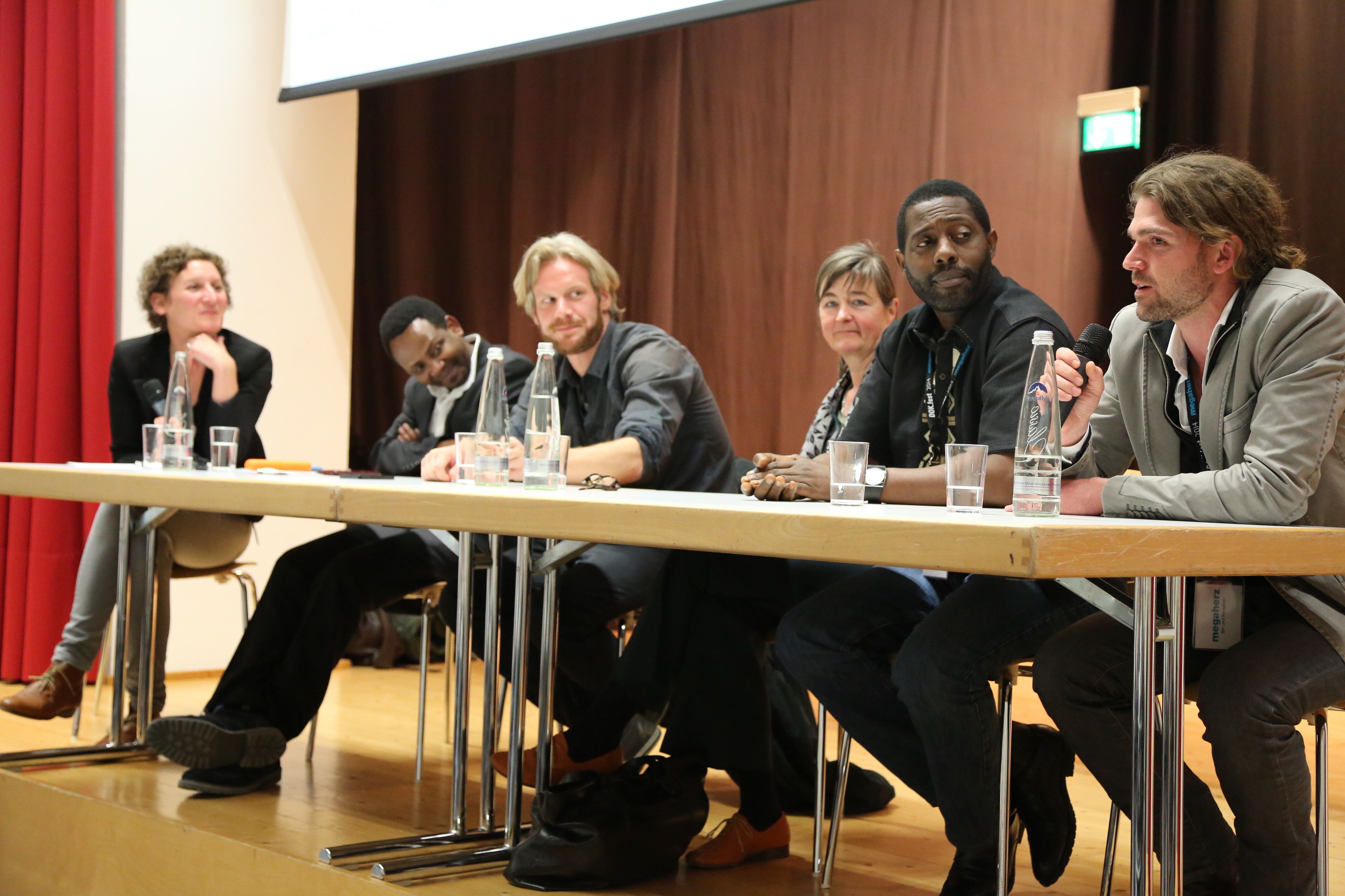 • v.l.n.r.: Barbara Off (DOK.fest), Regisseur Gilbert Ndahayo (RWANDA: BEYOND THE DEADLY PIT), Florian Schewe (WE WERE REBELS), Bettina Kocher (Fernsehworkshop Entwicklungspolitik), Femi Odugbemi (iREP Lagos) und Steffen Weber (ZURÜCK IN DEN SÜDEN) / Copyright DOK.fest - Dorothea Seror