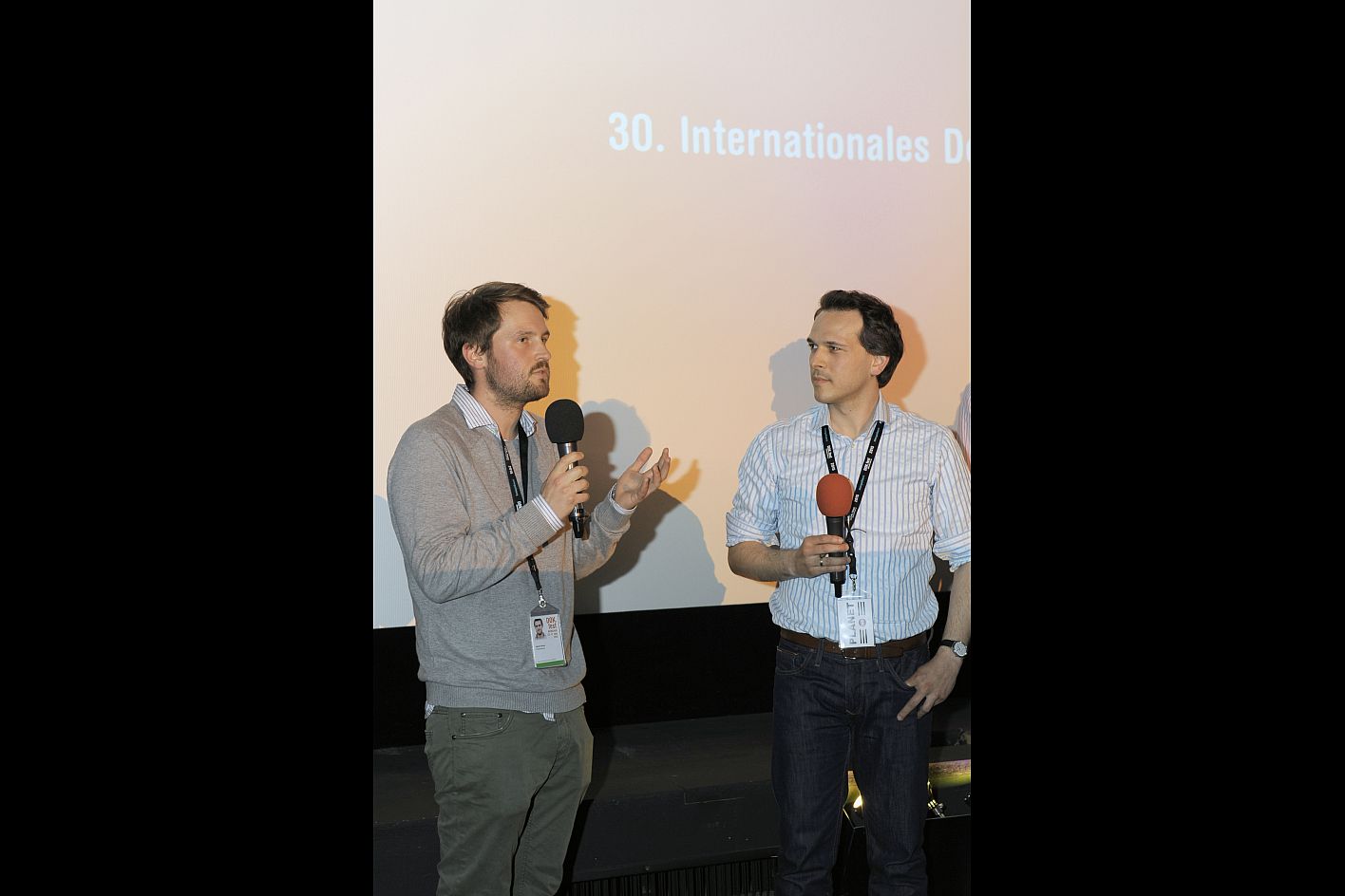 • Regisseur Jakob Gross (ABDO, li.) und Moderator Simon Hauck (DOK.fest, re.) / Copyright DOK.fest - Maren Willkomm