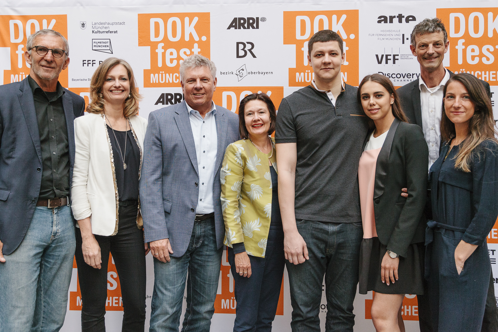 Werner Steer (Deutsches Theater), Carmen Bayer (Deutsches Theater), Dieter Reiter (Oberbürgermeister, Landeshauptstadt München), Dr. Carolin Kerschbaumer (Ministerialdirigentin, Bayerische Staatskanzlei), N.N., Margarita Mamun (Protagonistin OVER THE LIMIT), Daniel Sponsel (Festivalleiter), Marta Prus (Regisseurin OVER THE LIMIT) / Copyright: DOK.fest München