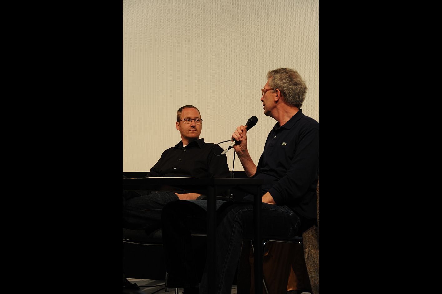 filmschool.forum HFF-Atelier mit Regisseur Nikolaus Geyrhalter (ABENDLAND, li.) und Prof. Alex Block (HFF, re.) / Copyright DOK.fest - Maren Bornemann