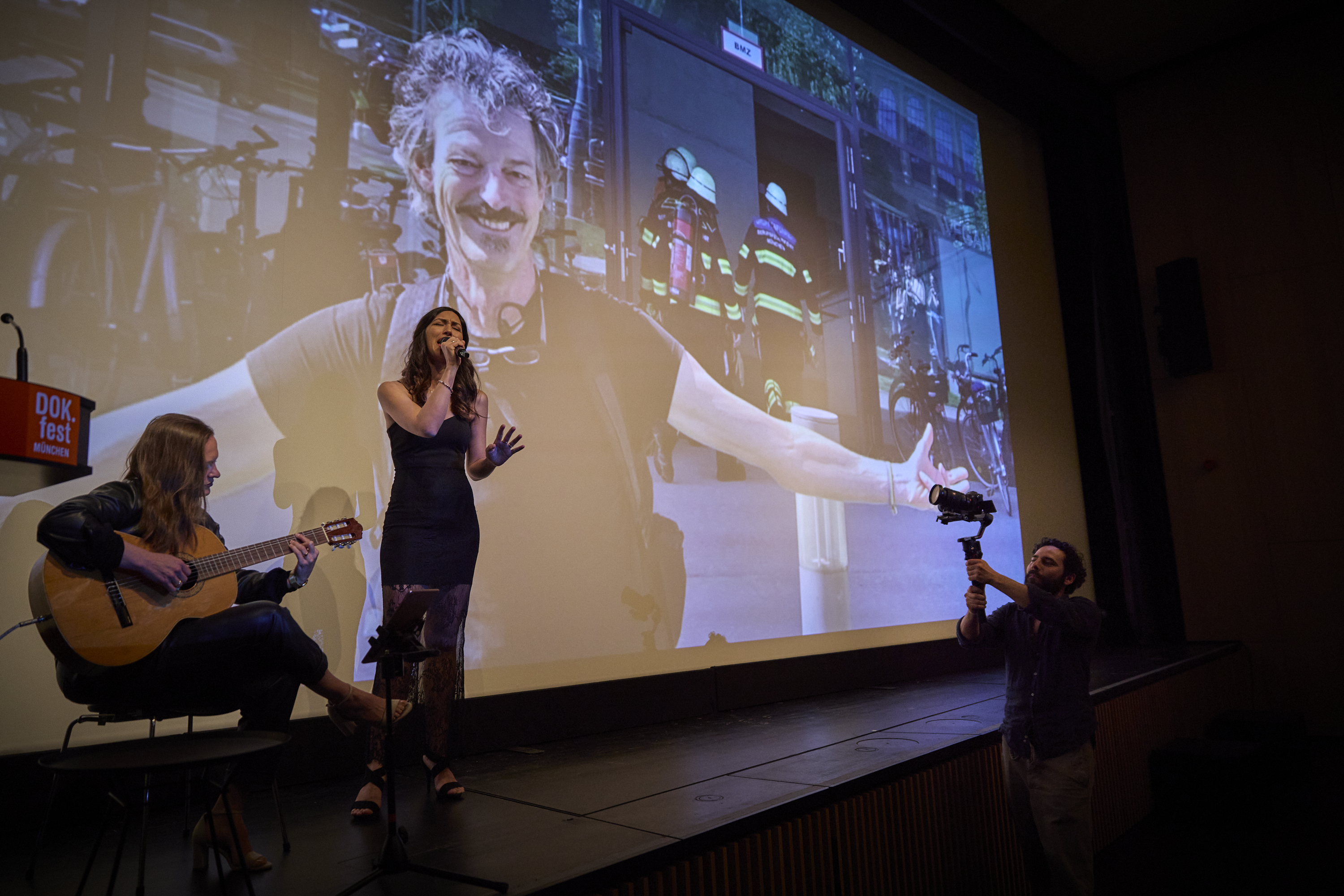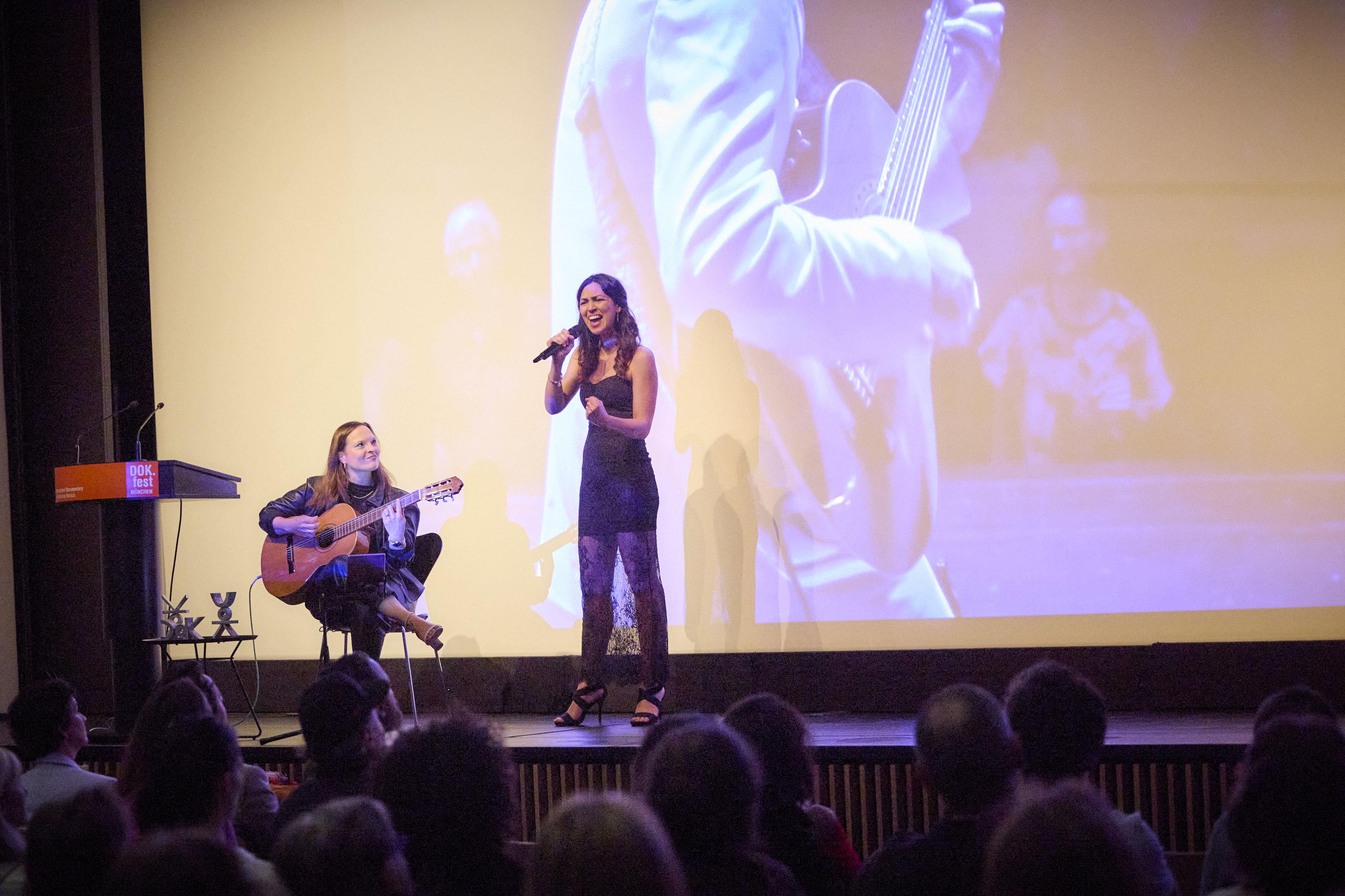 Amelie Haidt an der Gitarre und Sängerin Zuleika Morsut bei der Hauptpreisverleihung (c) DOK.fest München 2025
