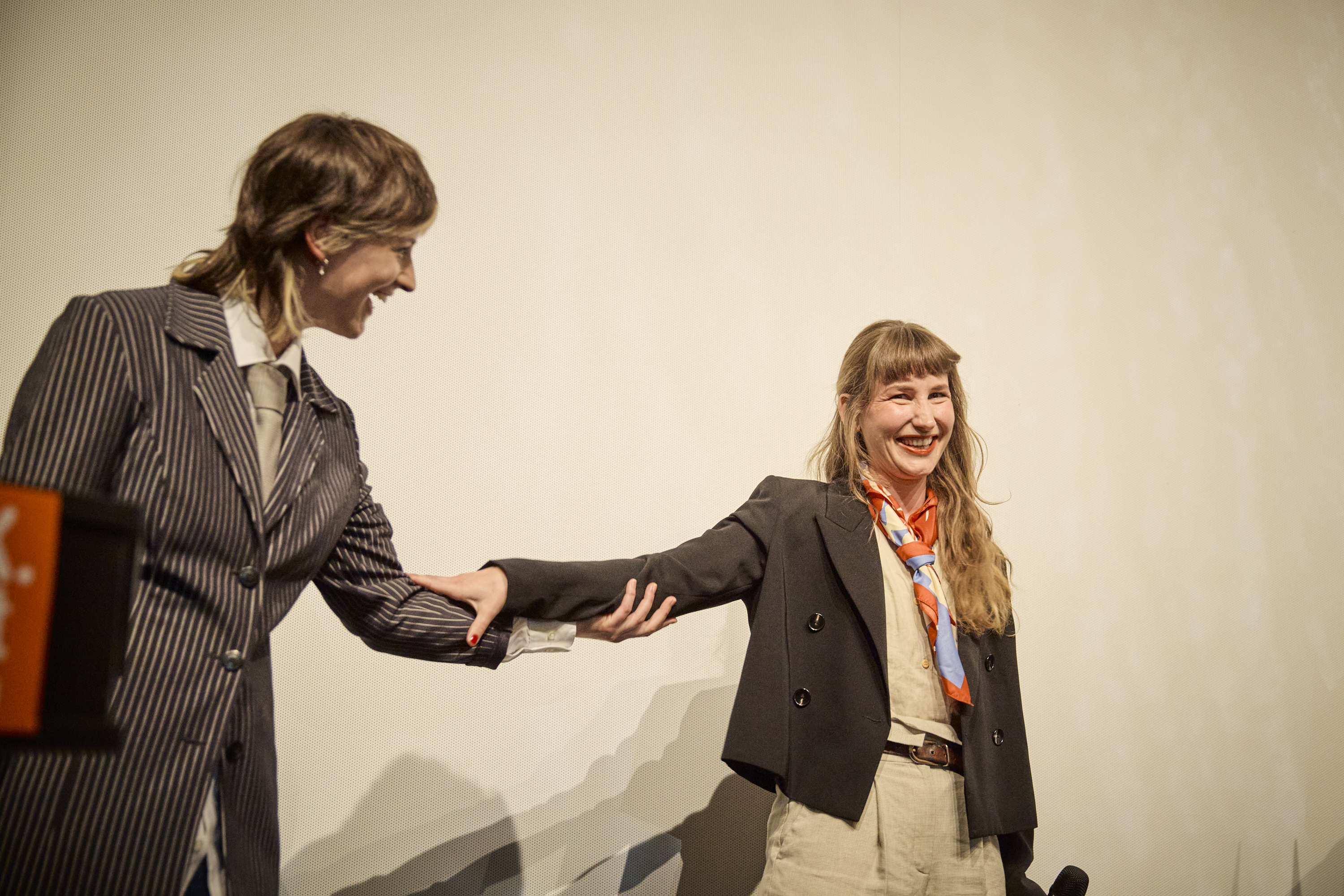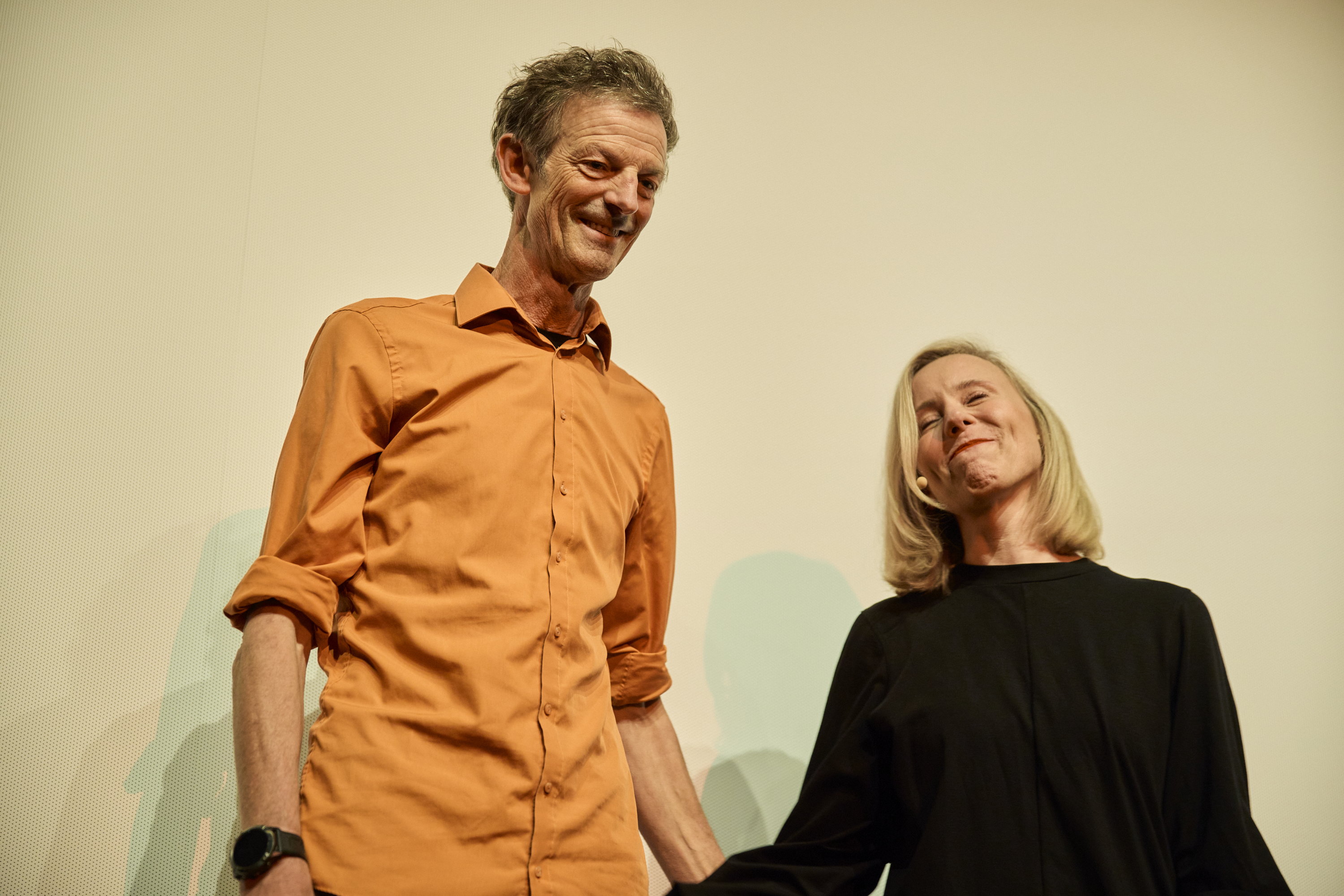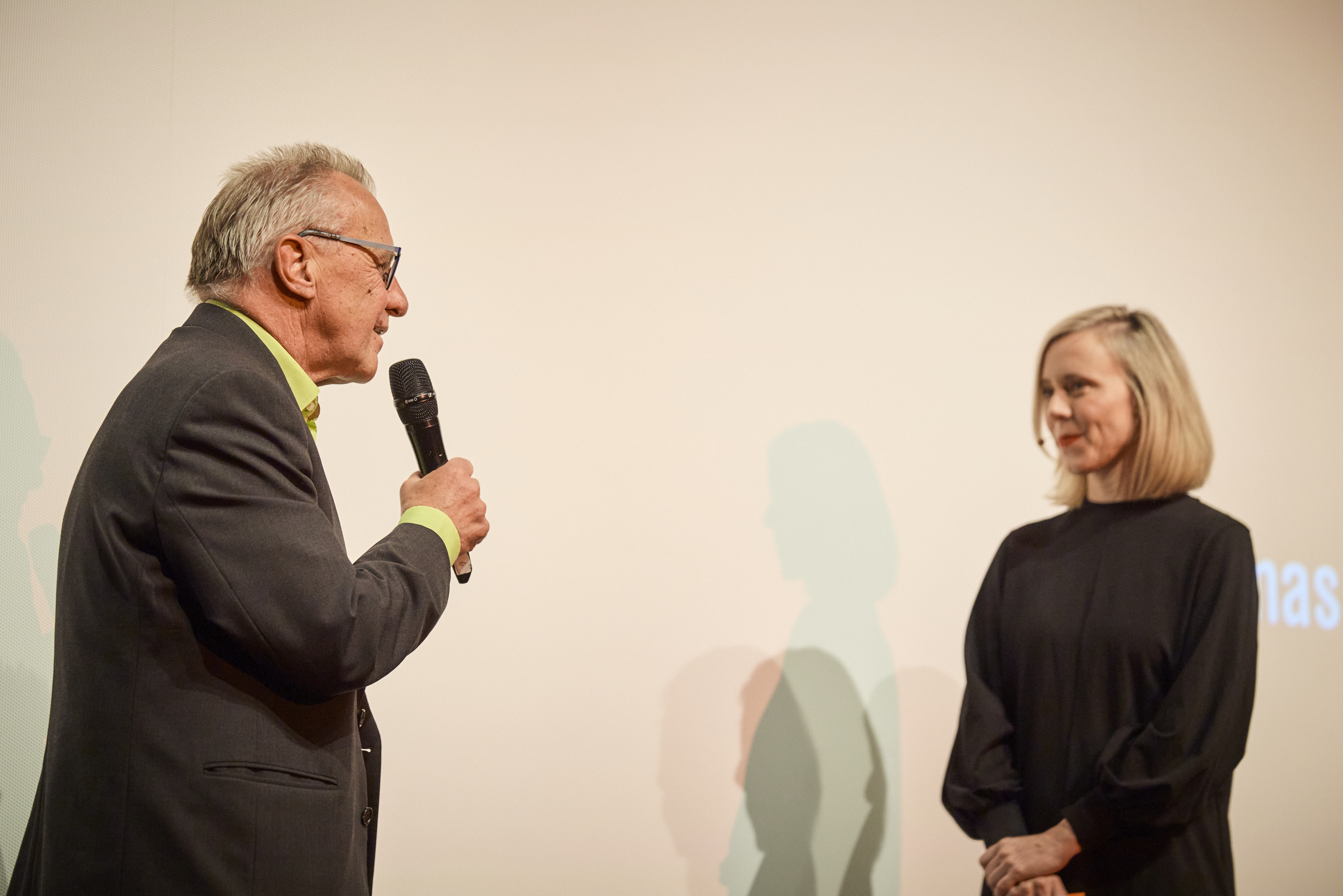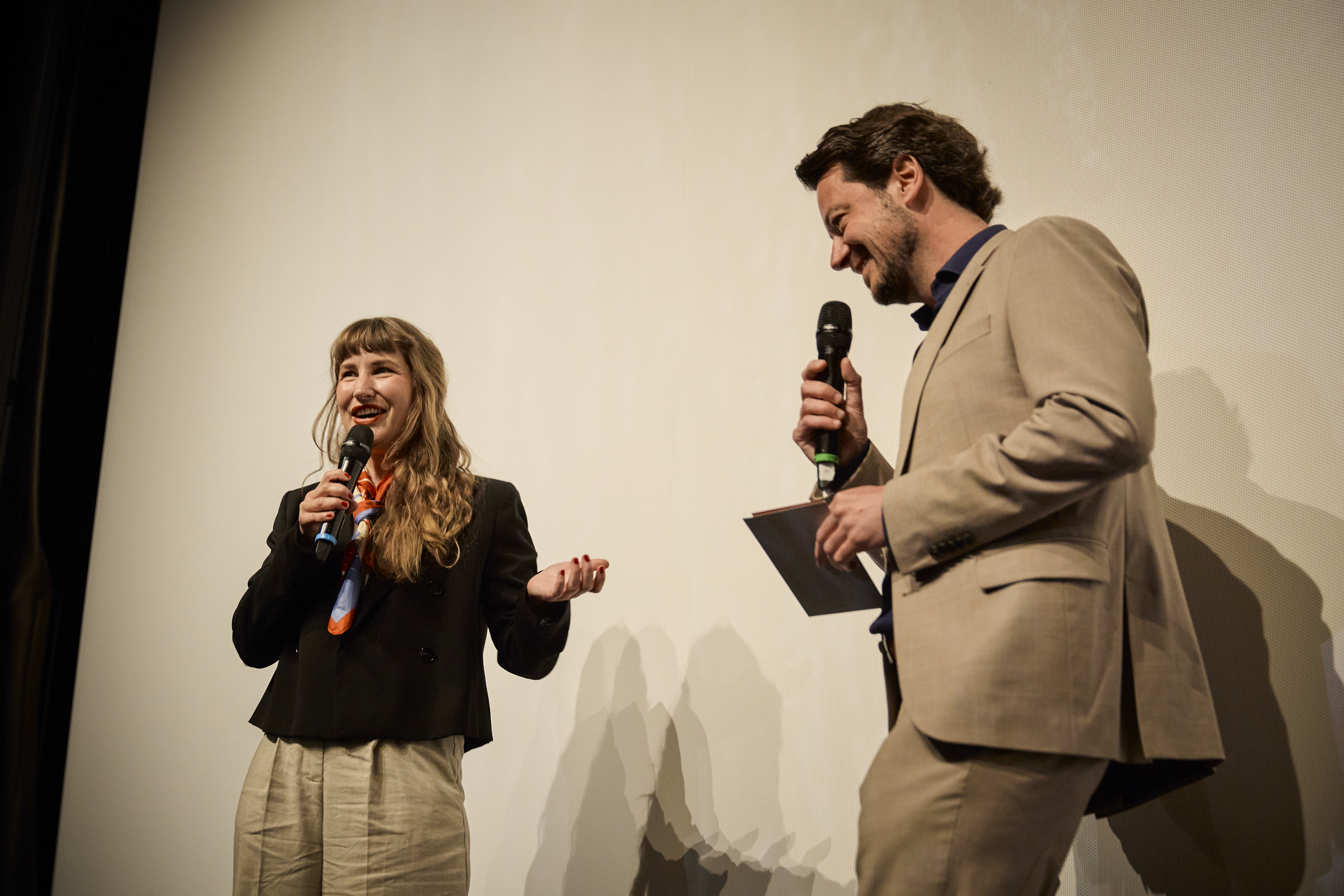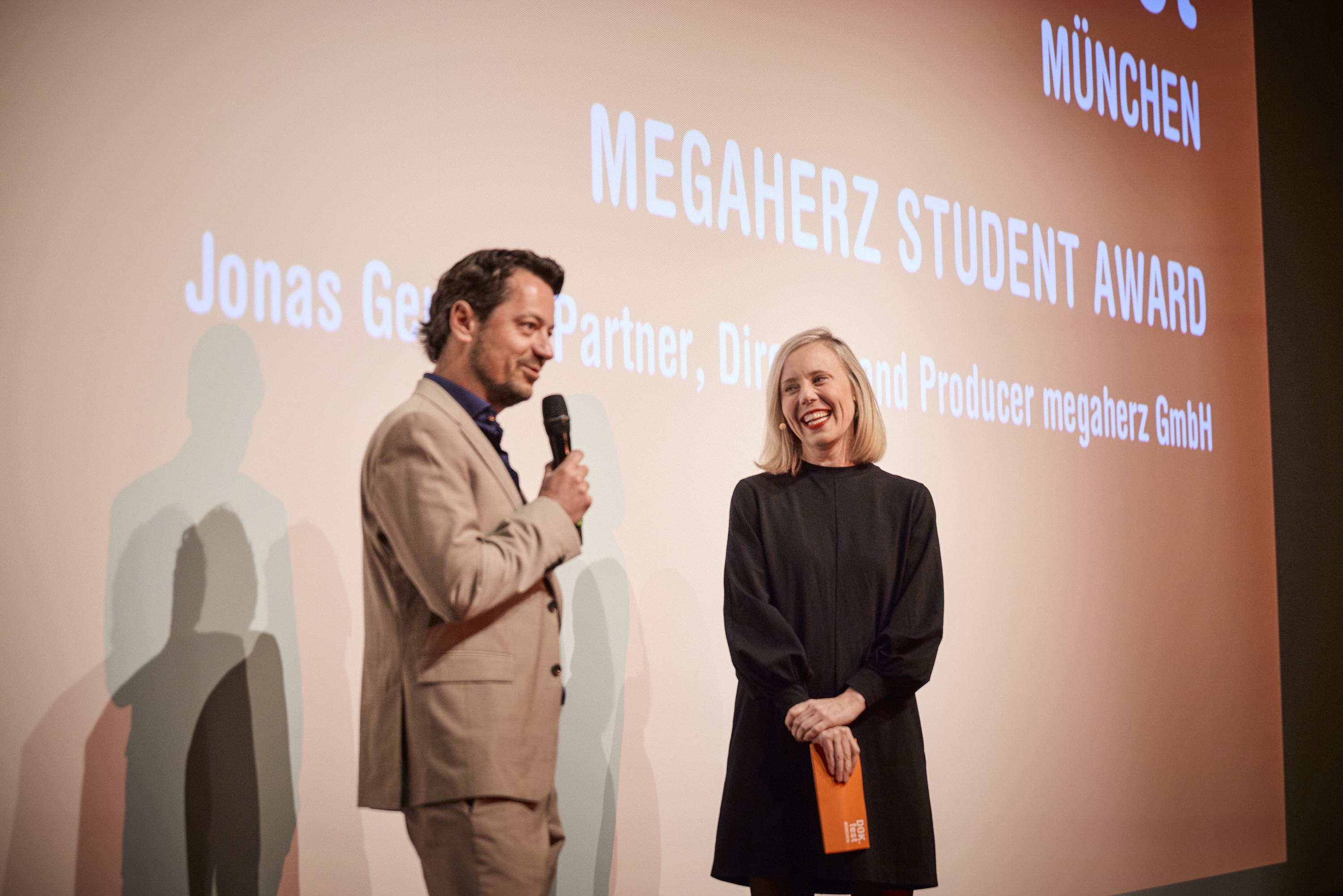 Jonas Gernstl und Moderatorin Christina Wolf bei der Hauptpreisverleihung (c) DOK.fest München 2025