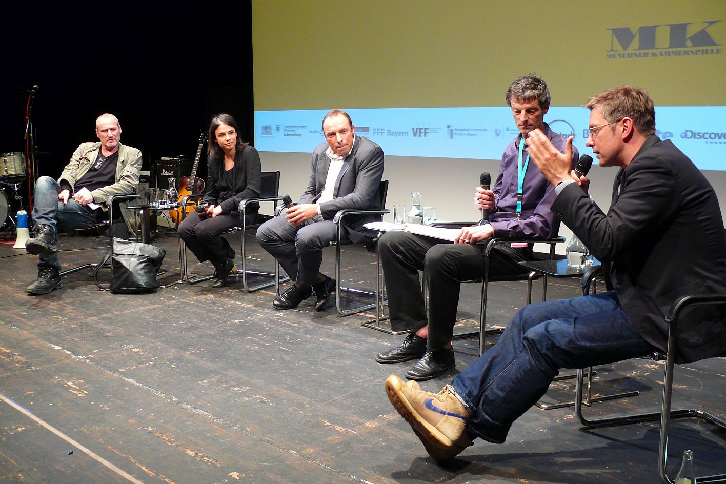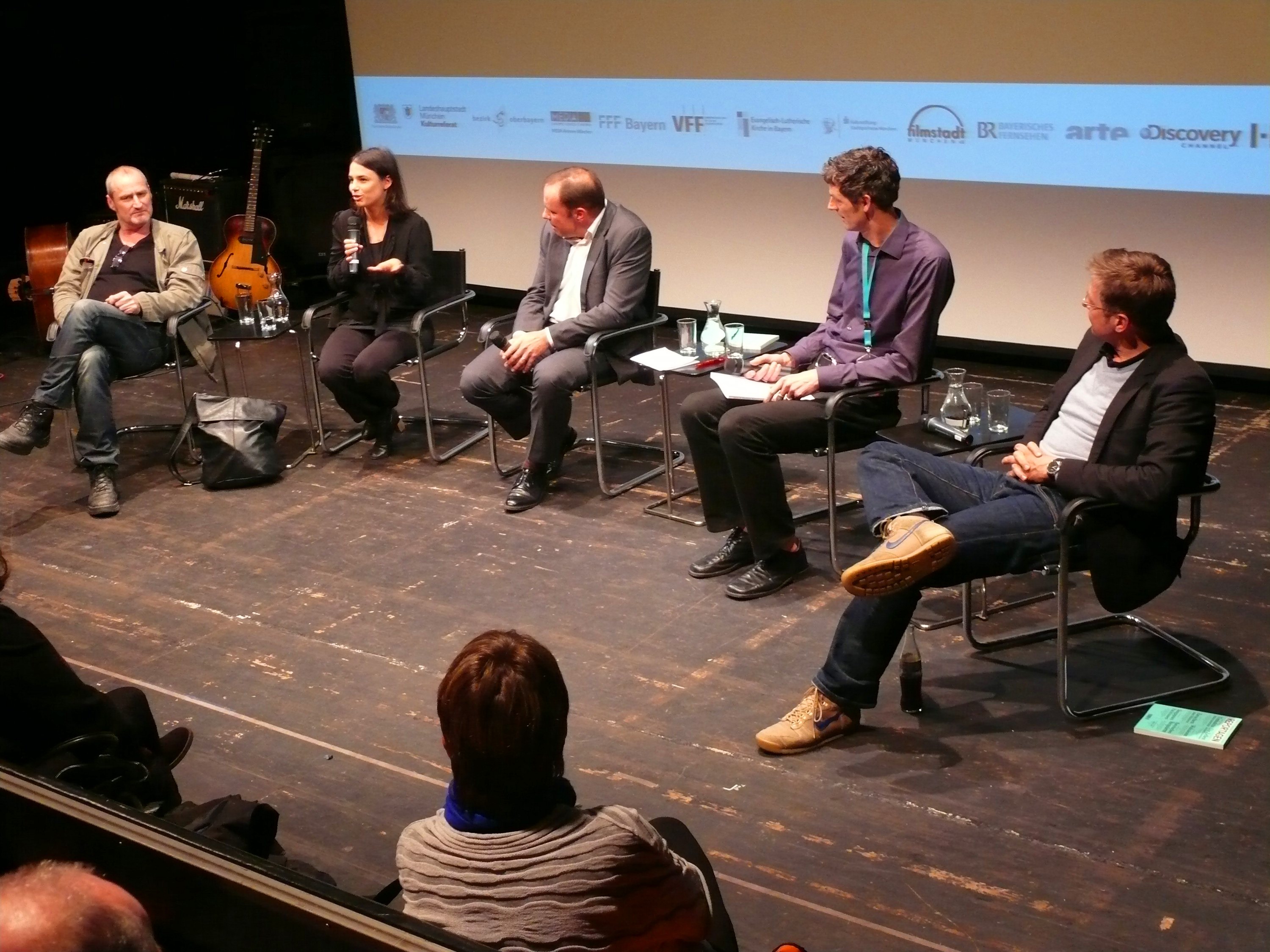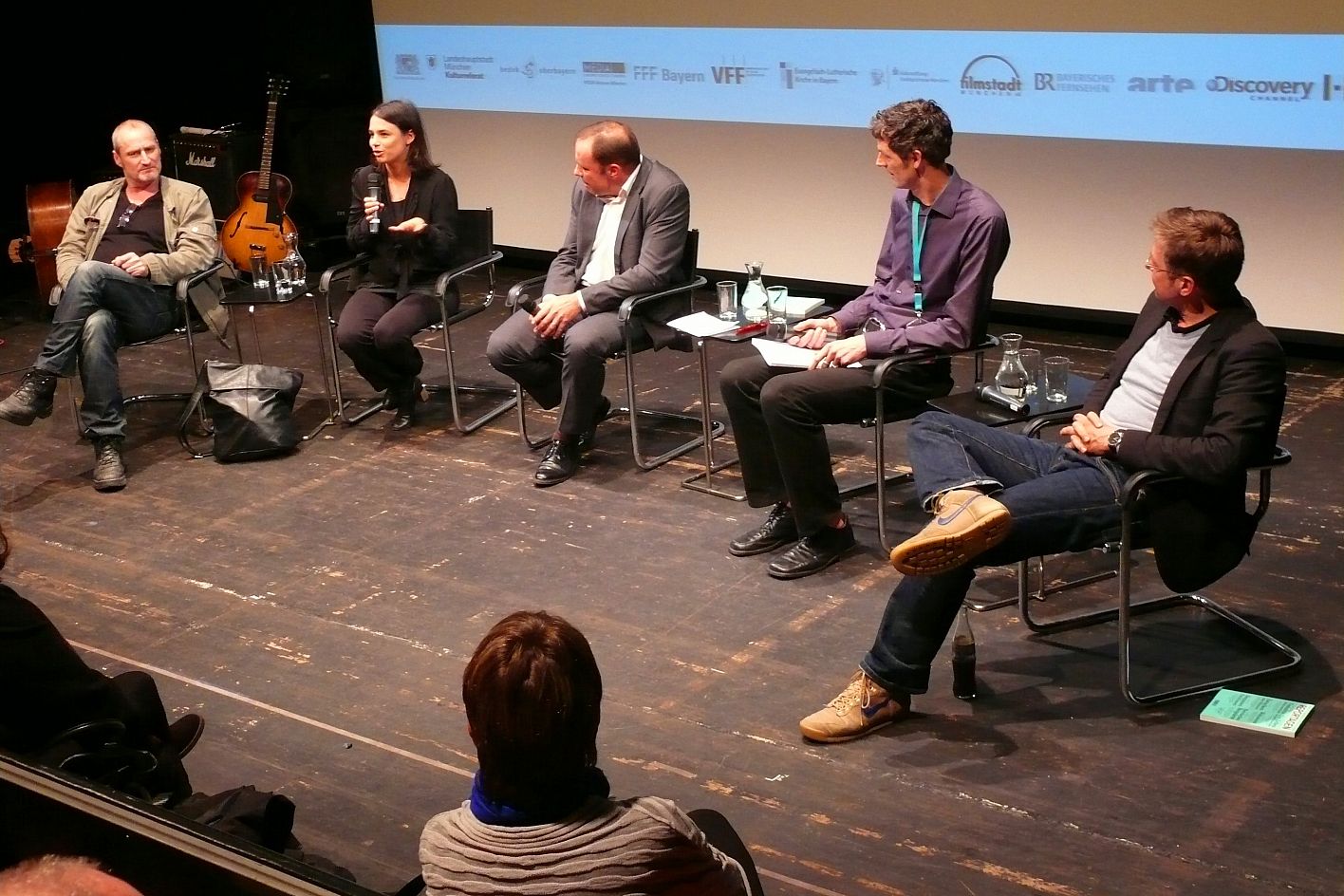 v.l.n.r.: Dramaturg Matthias Günther (Münchner Kammerspiele), Regisseurin Anja Salomonowitz (DIE 727 TAGE OHNE KARAMO), Moderator Daniel Puntas Bernet, Festivalleiter Daniel Sponsel und Autor Björn Bicker (Münchner Kammerspiele) / Copyright DOK.fest - Andrea Naica-Loebell