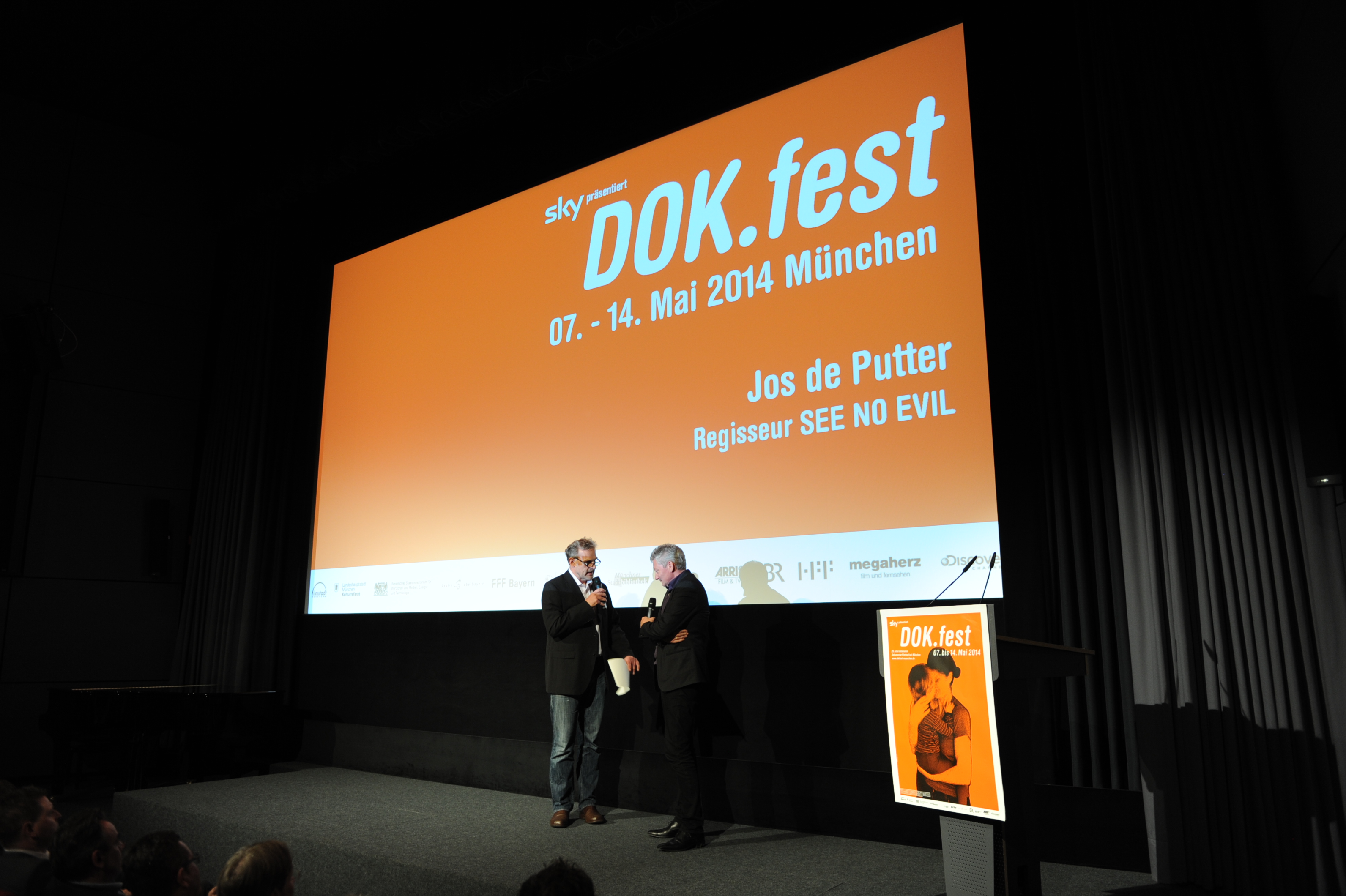 • Moderator Moritz Holfelder (li.) und Regisseur Jos de Putter (SEE NO EVIL,re.) bei der DOK.fest Eröffnung in der HFF / Copyright DOK.fest - Maren Willkomm