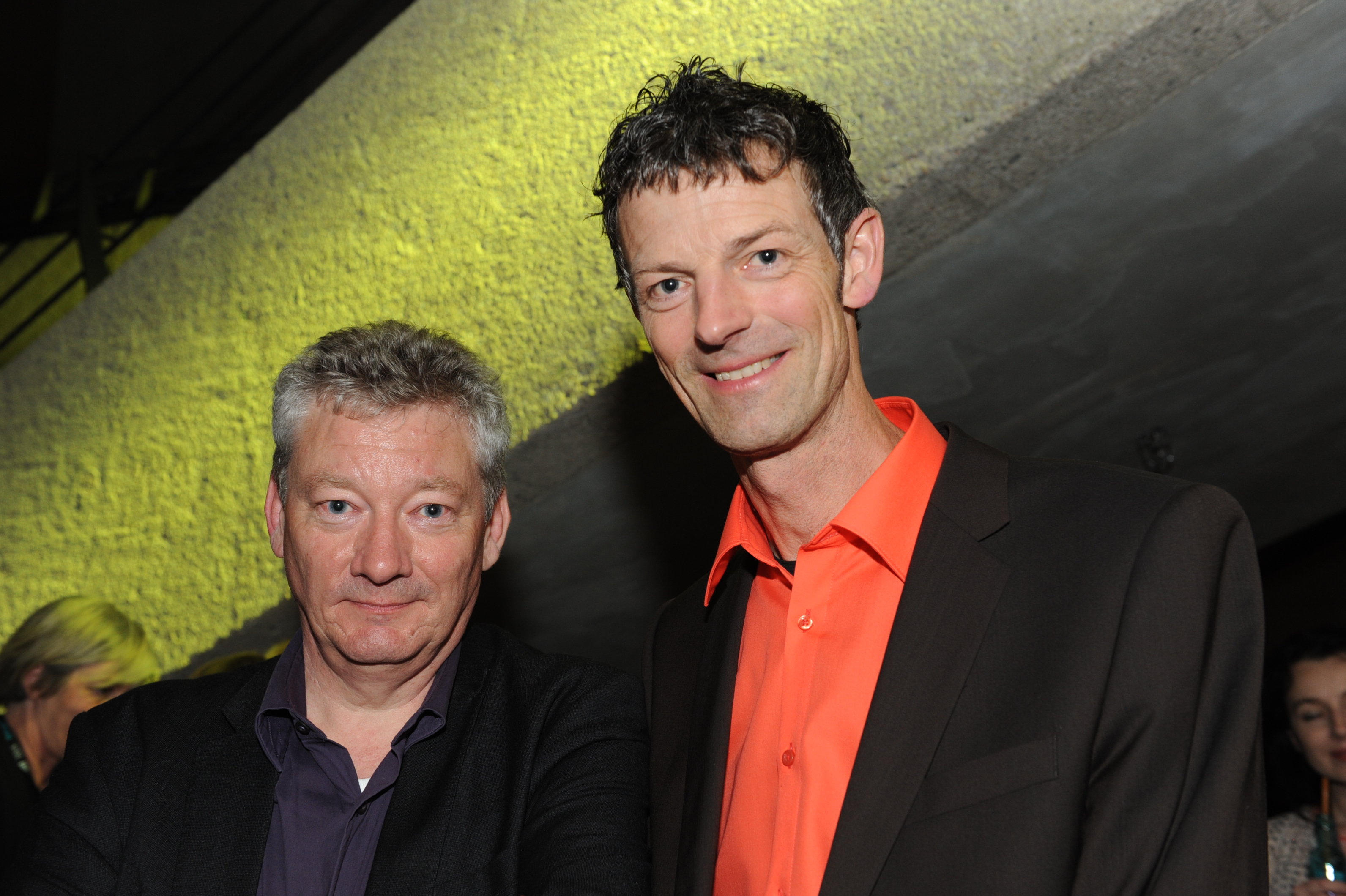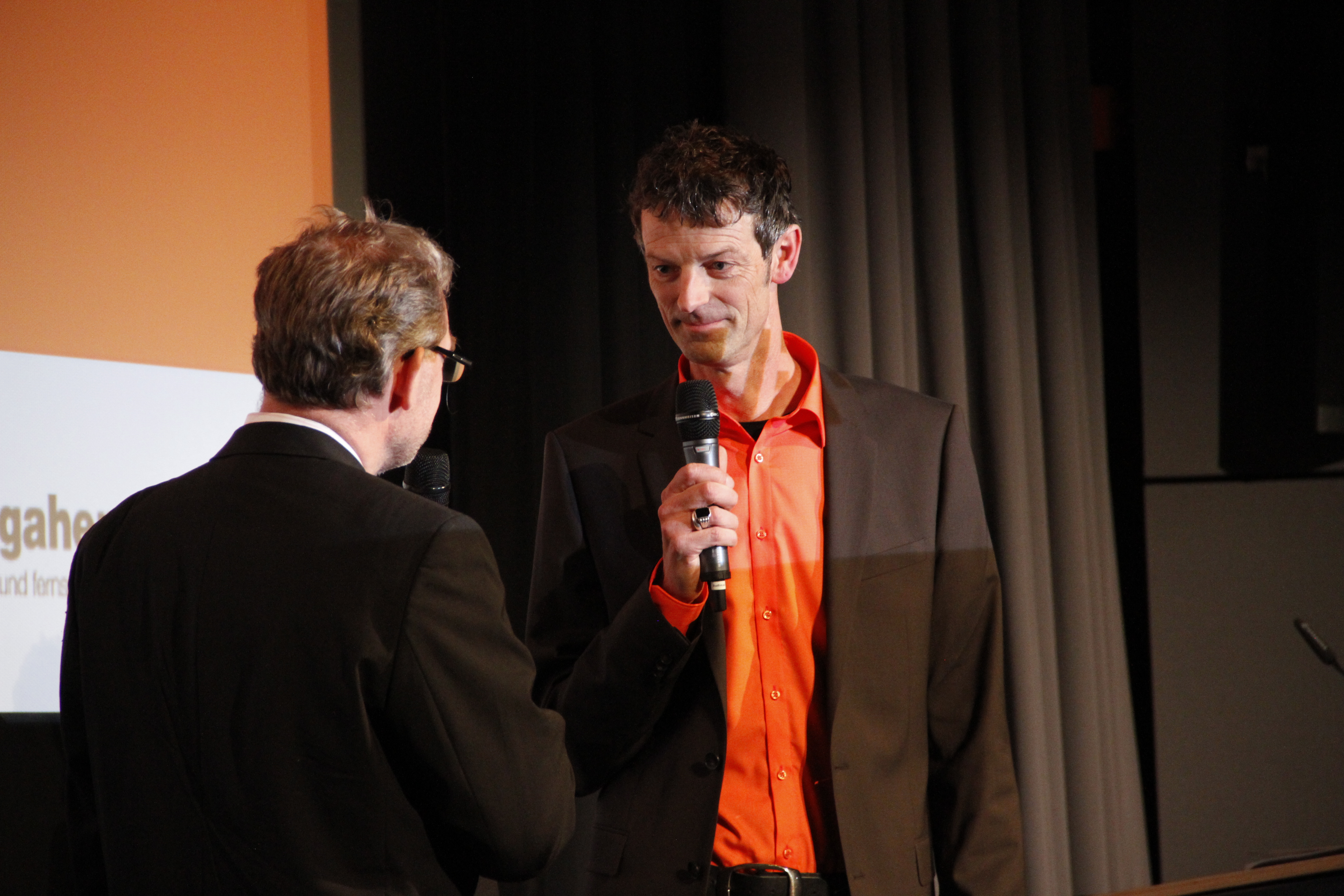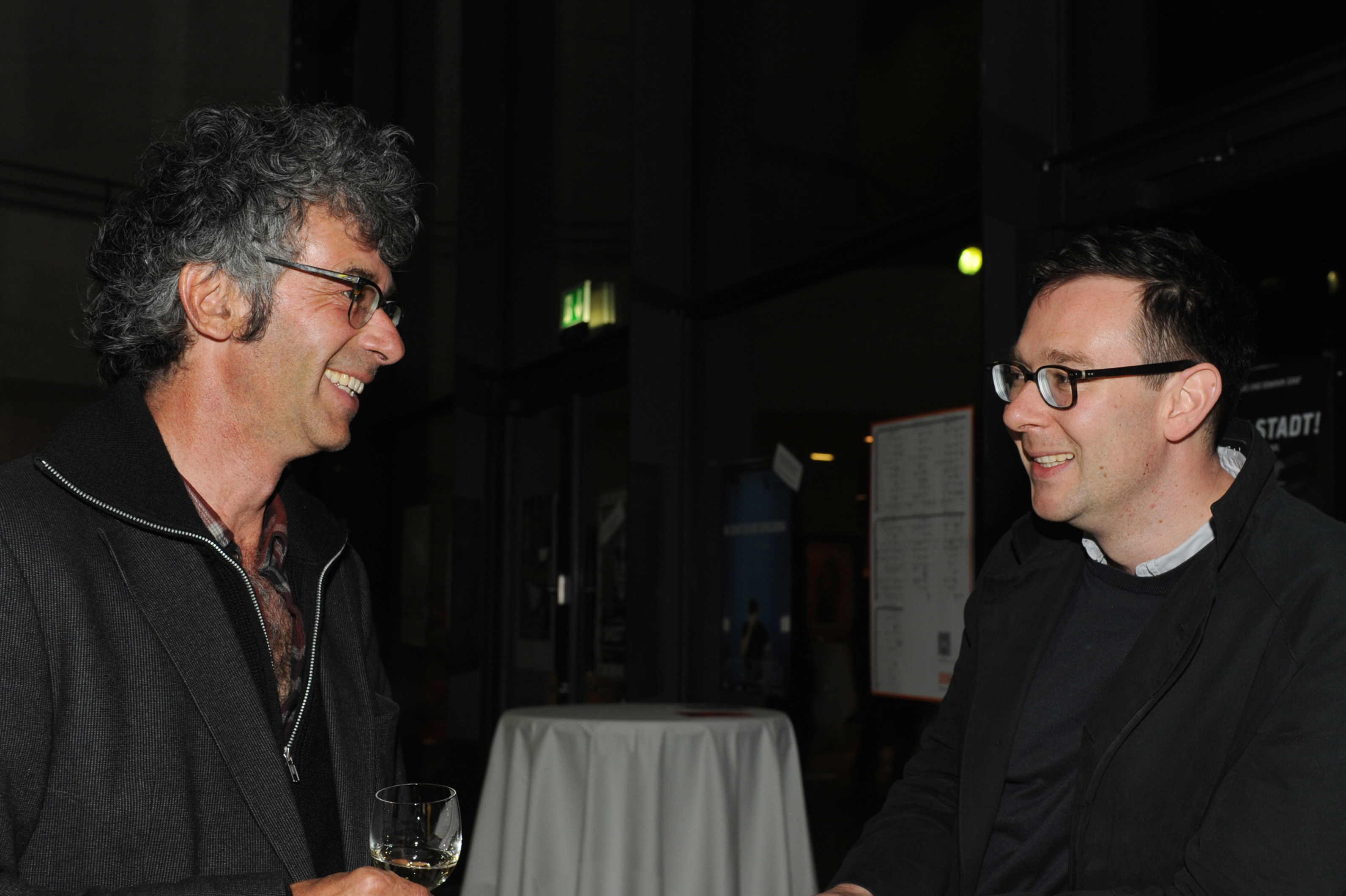 • Frank Heidemann (Jury DOK.horizonte, li.) mit Regisseur Jos de Putter (SEE NO EVIL) / Copyright DOK.fest - Maren Willkomm