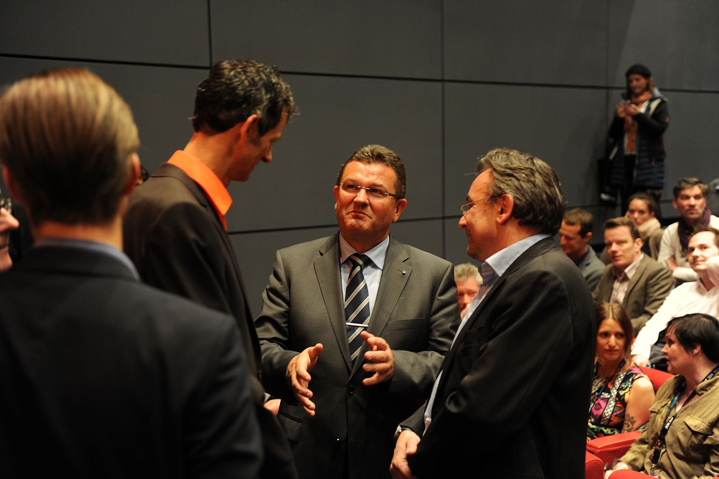 • 3.v.r. Manuel Feifel (Vertretung der Regierung von Québec, 3.v.r.) und Festivalleiter Daniel Sponsel (3.v.l.) / Copyright DOK.fest - Maren Willkomm
