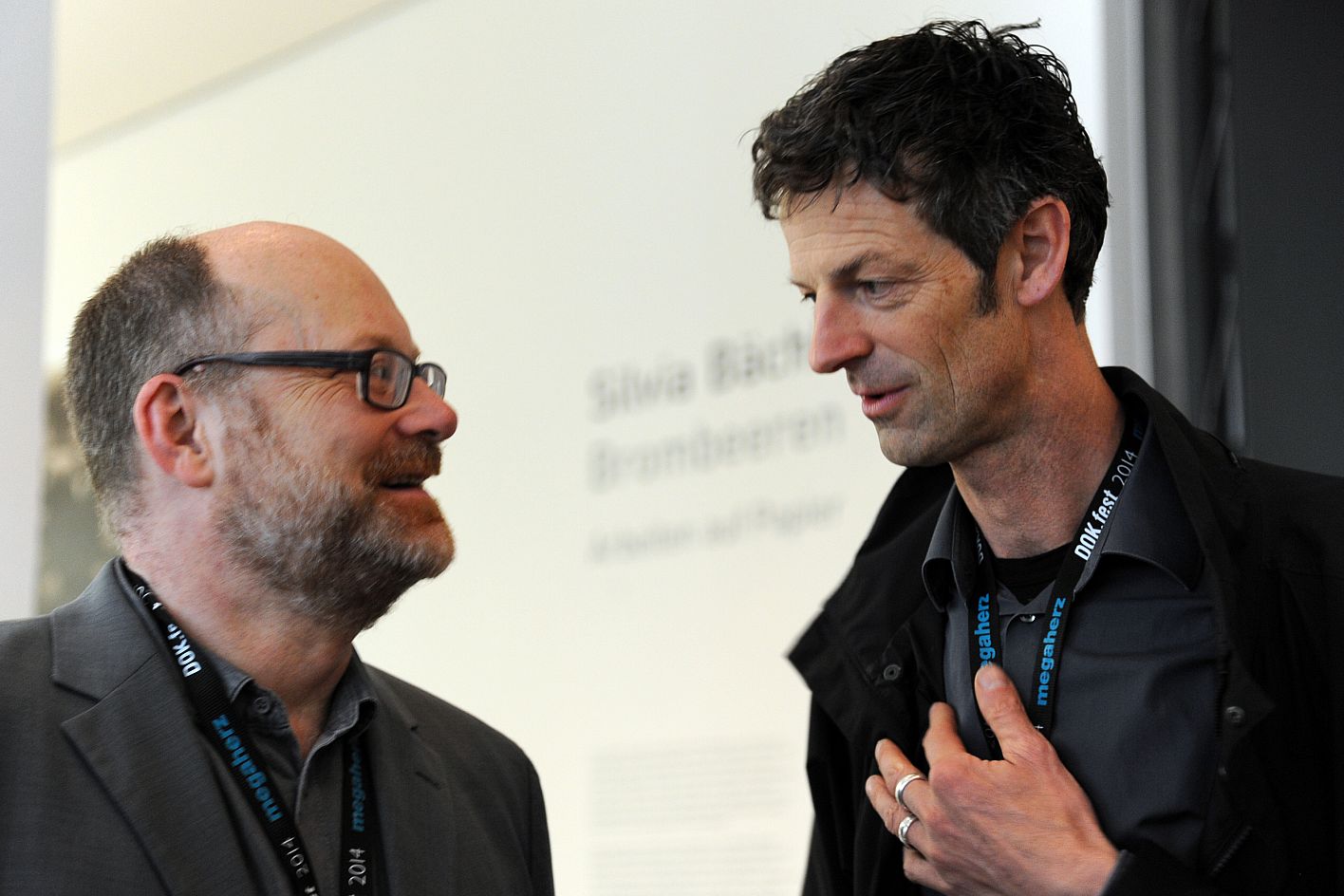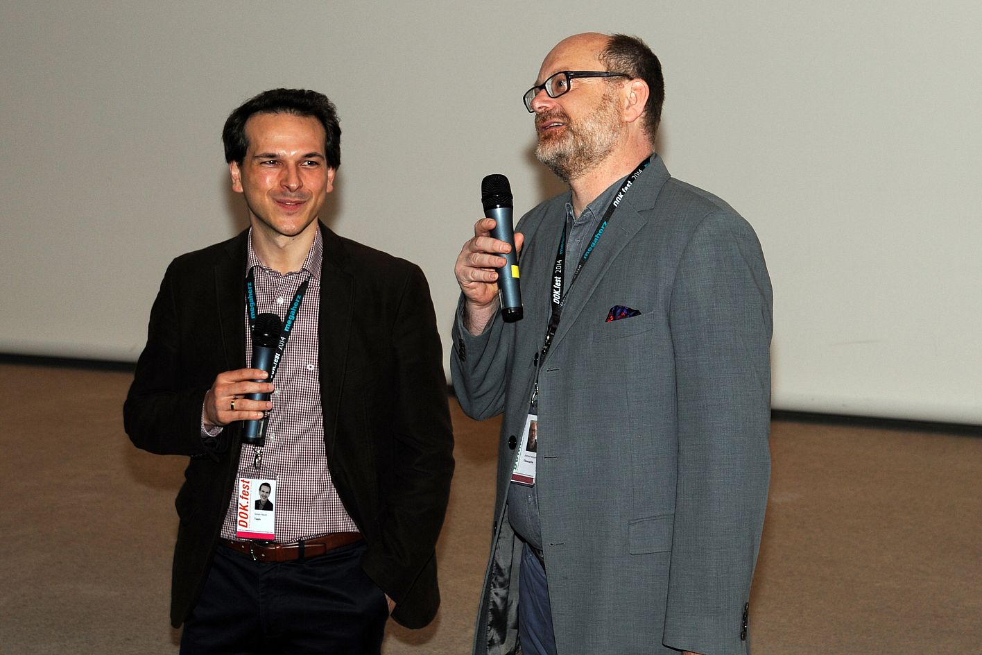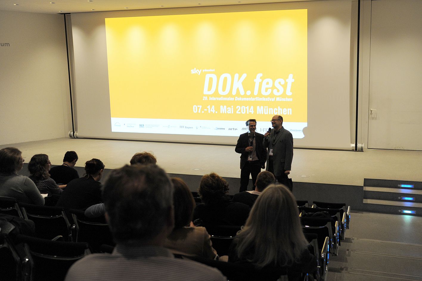 Regisseur Johannes Holzhausen (DAS GROSSE MUSEUM, li.) und Festivalleiter Daniel Sponsel (re.) bei der Filmvorstellung DAS GROSSE MUSEUM in der Pinakothek der Moderne / Copyright DOK.fest - Maren Willkomm