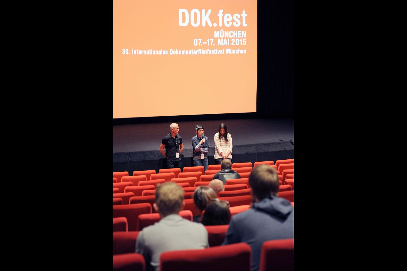 • Moderator Simon Hauck (DOK.fest, 1.v.l.), Regisseurin Katharina Köster (NATASCHA, 2.v.l.), Kameramann Tobias Tempel (1.v.r.) / Copyright DOK.fest - Maren Willkomm