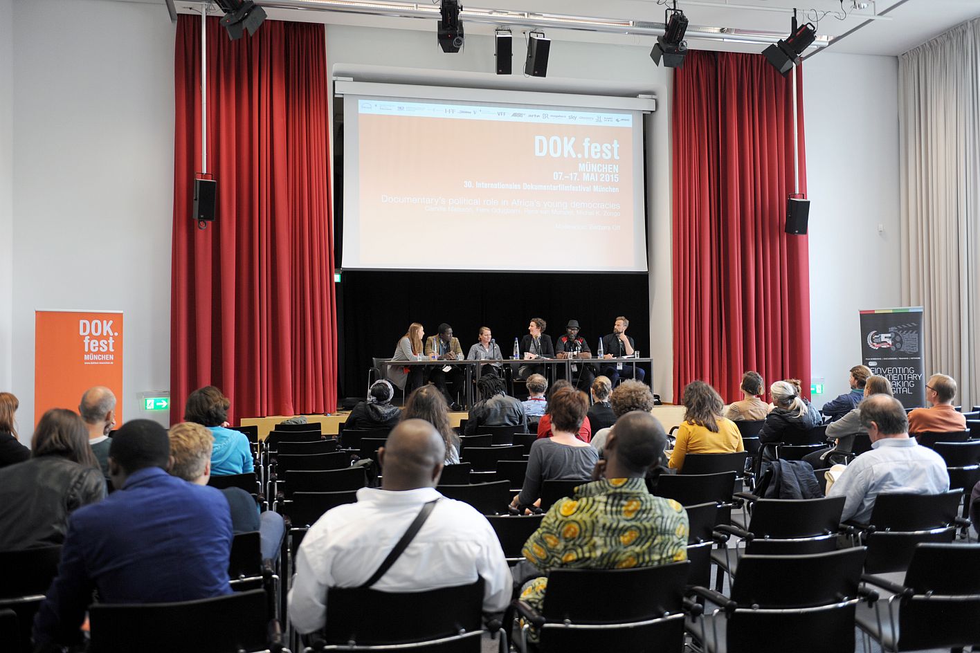 Podiumsdiskussion DOK.network Africa, v.l.n.r.: v.l.n.r.: Dolmetscherin Stephanie Benyr, Regisseur Michel K. Zongo (LA SIRÈNE DE FASO FANI), Regisseurin Camilla Nielsson (DEMOCRATS), Barbara Off (Leitung DOK.network Africa), Femi Odugbemi (IREP) und Rens de Munster (Dänisches Institut) / Copyright DOK.fest - Maren Willkomm