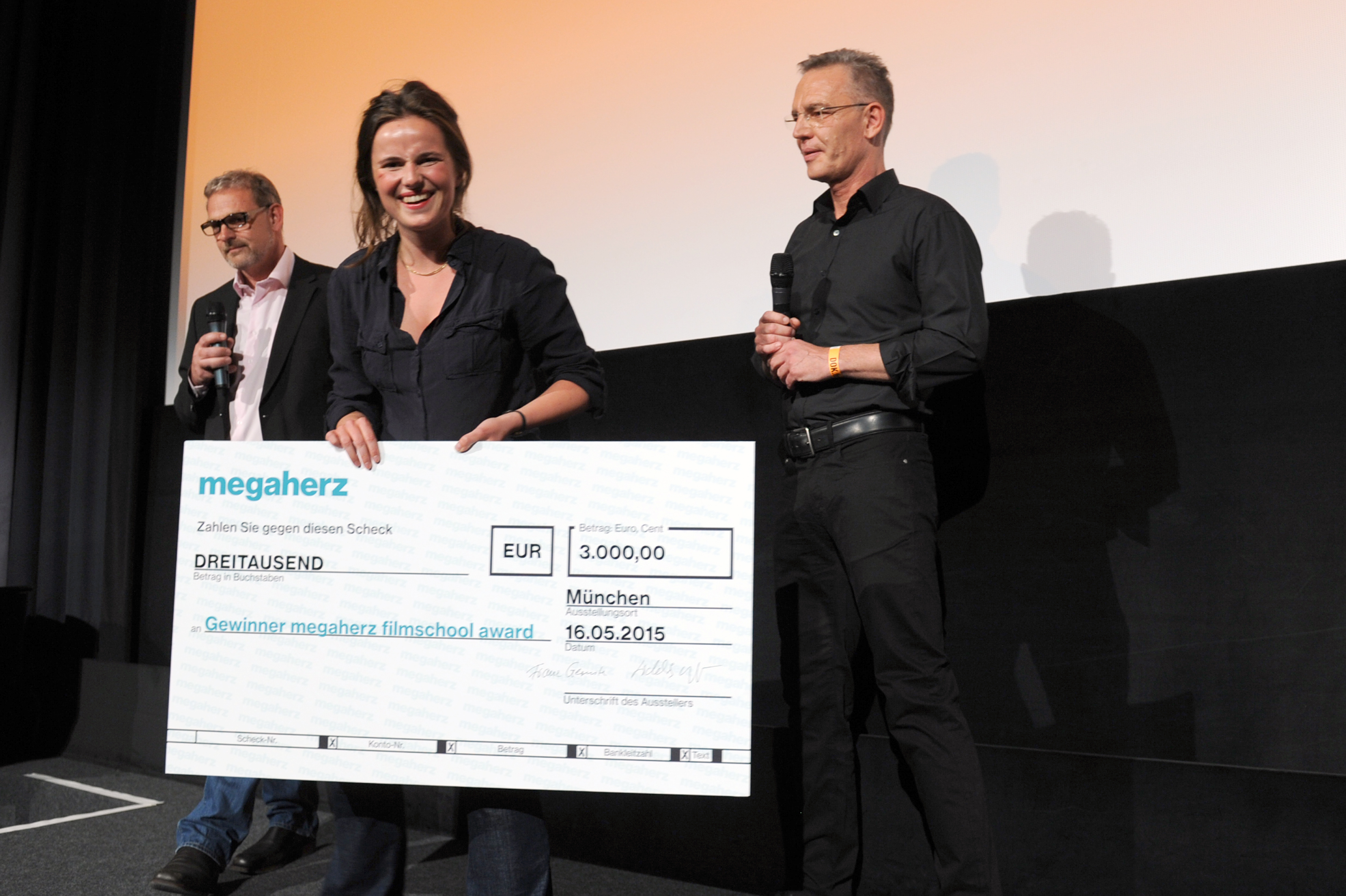 • Megaherz Filmschulpreis 2015, v.l.n.r.: Moderator Moritz Holfelder, Regisseurin Mae De Jong (IF MAMA AIN'T HAPPY, NOBODY'S HAPPY) und Fidelis Mager (megaherz) / Copyirght DOK.fest - Maren Willkomm