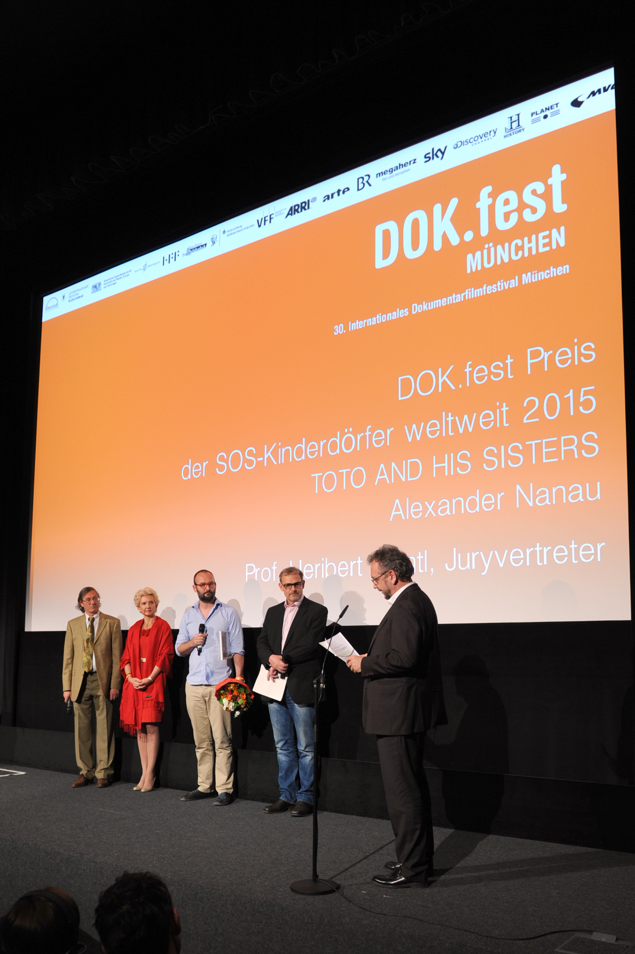 • SOS-Kinderdörferpreis 2015, v.l.n.r.: Peider Defilla (B.O.A. Videofilmkunst), Christine Keherer (SOS Kinderdörfer), Regisseur Alexander Nanau (TOTO AND HIS SISTERS) und Michaela Braun (SOS Kinderdörfer) / Copyright DOK.fest - Maren Willkomm