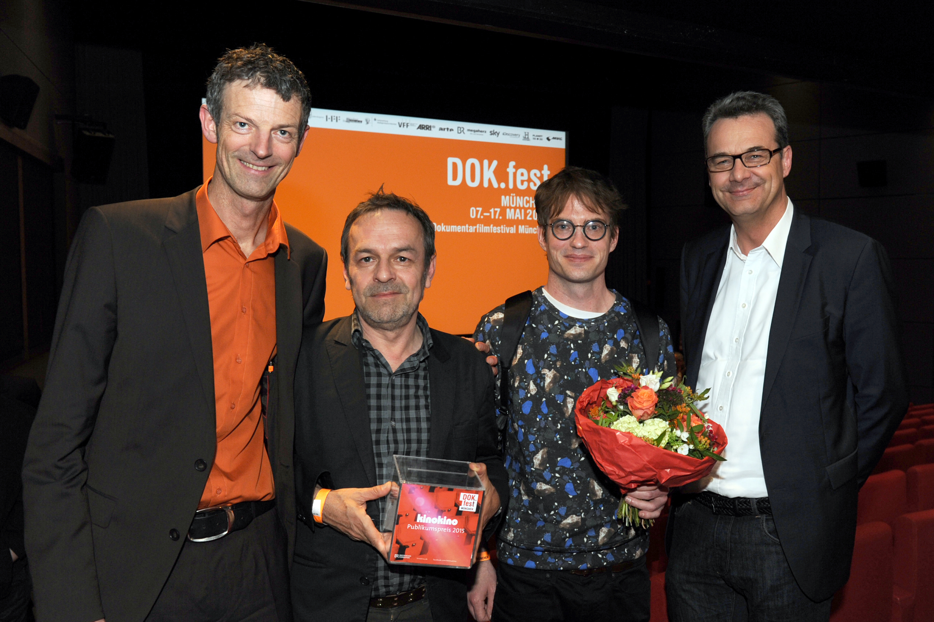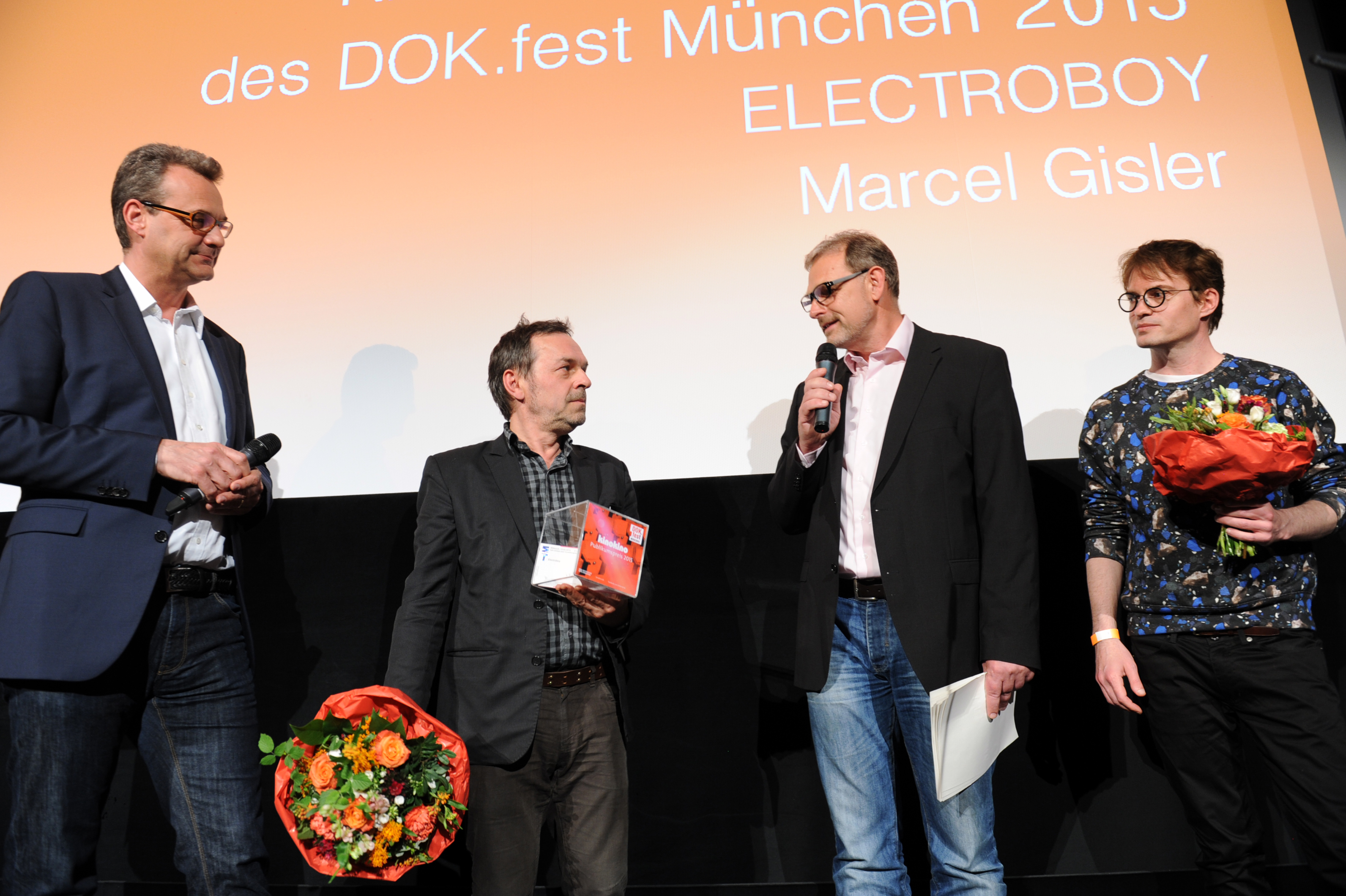 • kino kino Publikumspreis 2015, v.l.n.r.: Festivalleiter Daniel Sponsel, Regisseur Marcel Gisler (ELECTROBOY), Protagonist Florian Burkhardt (ELECTROBOY) und Thomas Sessner (BR) / Copyright DOK.fest - Maren Willkomm