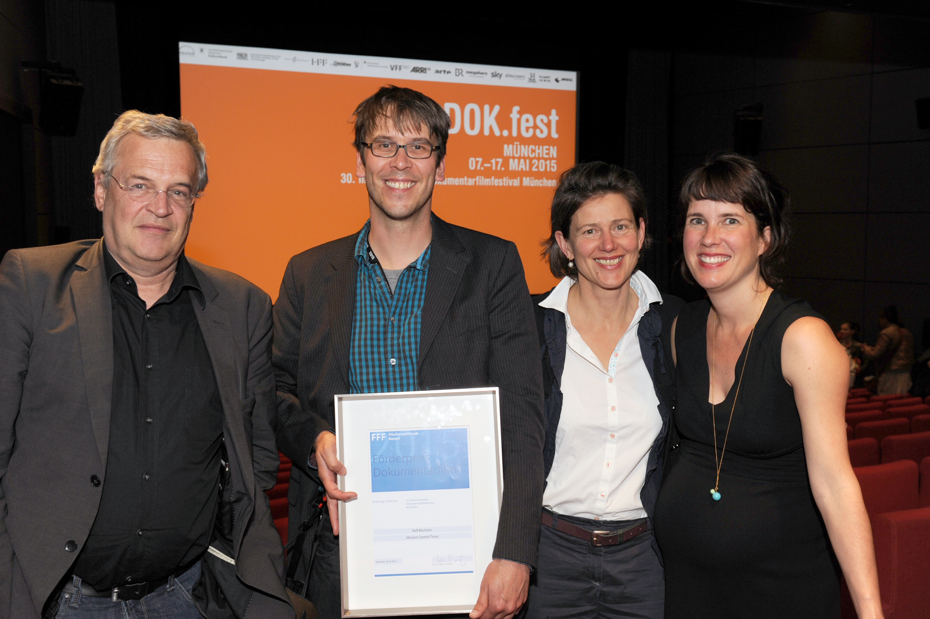• FFF-Förderpreis 2015, v.l.n.r.: Werner Fuchs (Jury FFF-Förderpreis), Regisseur Ralf Bücheler (MISSION CONTROL TEXAS), Nicole Leykauf (Jury FFF-Förderpreis) und Julia Rappold (FFF Bayern) / Copyright DOK.fest - Maren Willkomm