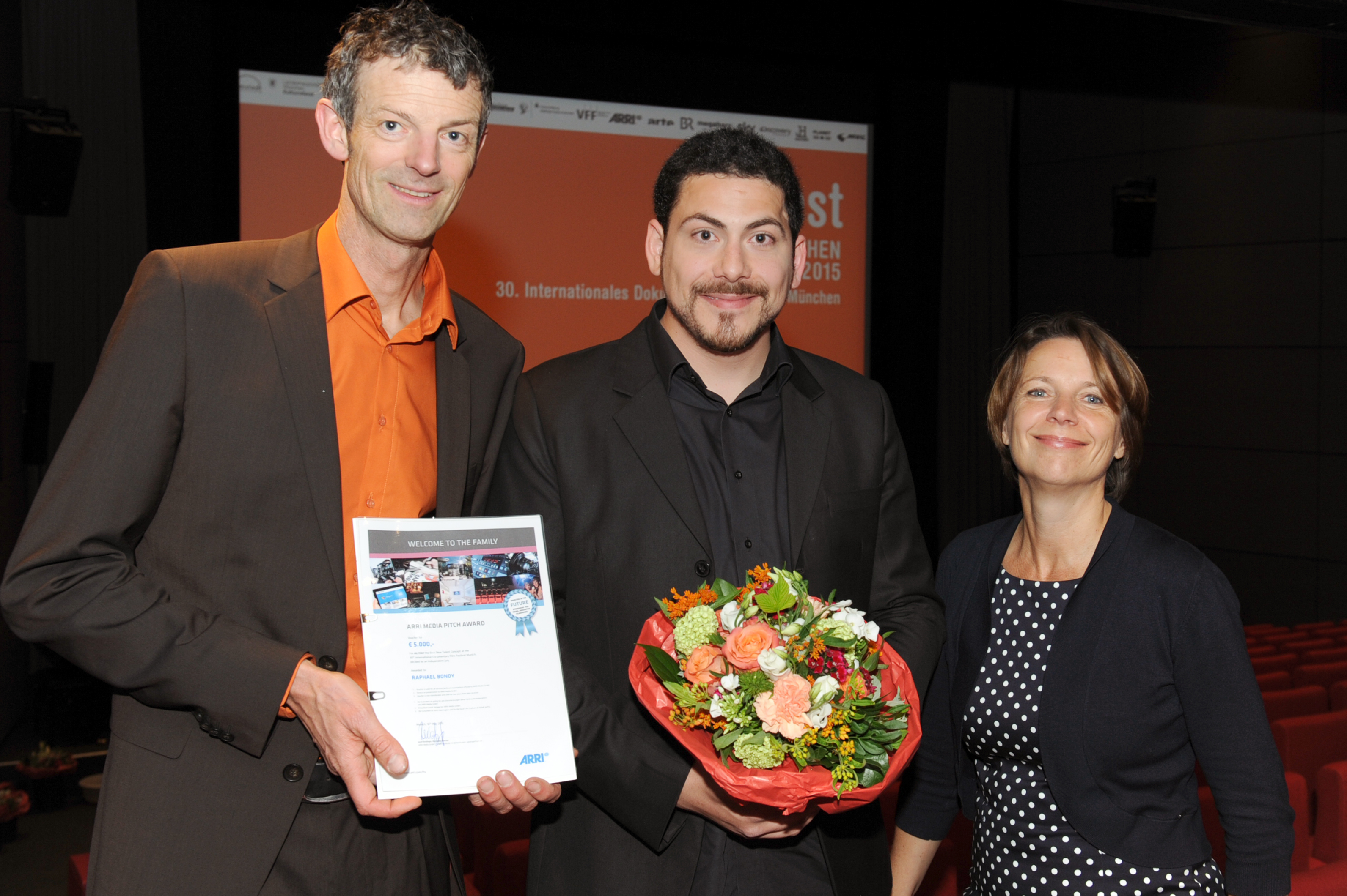 • ARRI pitch.award, v.l.n.r.: Festivalleiter Daniel Sponsel, Regisseur Raphael Bondy (ALIYAH) und Petra Felber (Juryvertreterin) / Copyright DOK.fest - Maren Willkomm