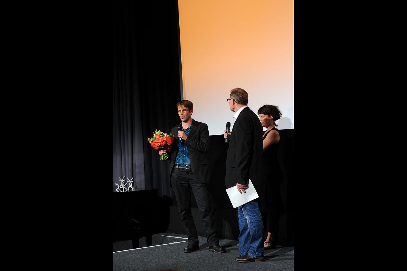 v.l.n.r.: Peider Defilla (B.O.A. Videofilmkunst), Michaela Braun (SOS Kinderdörfer) und Regisseur Alexander Nanau (TOTO AND HIS SISTERS) / Copyright DOK.fest - Maren Willkomm
