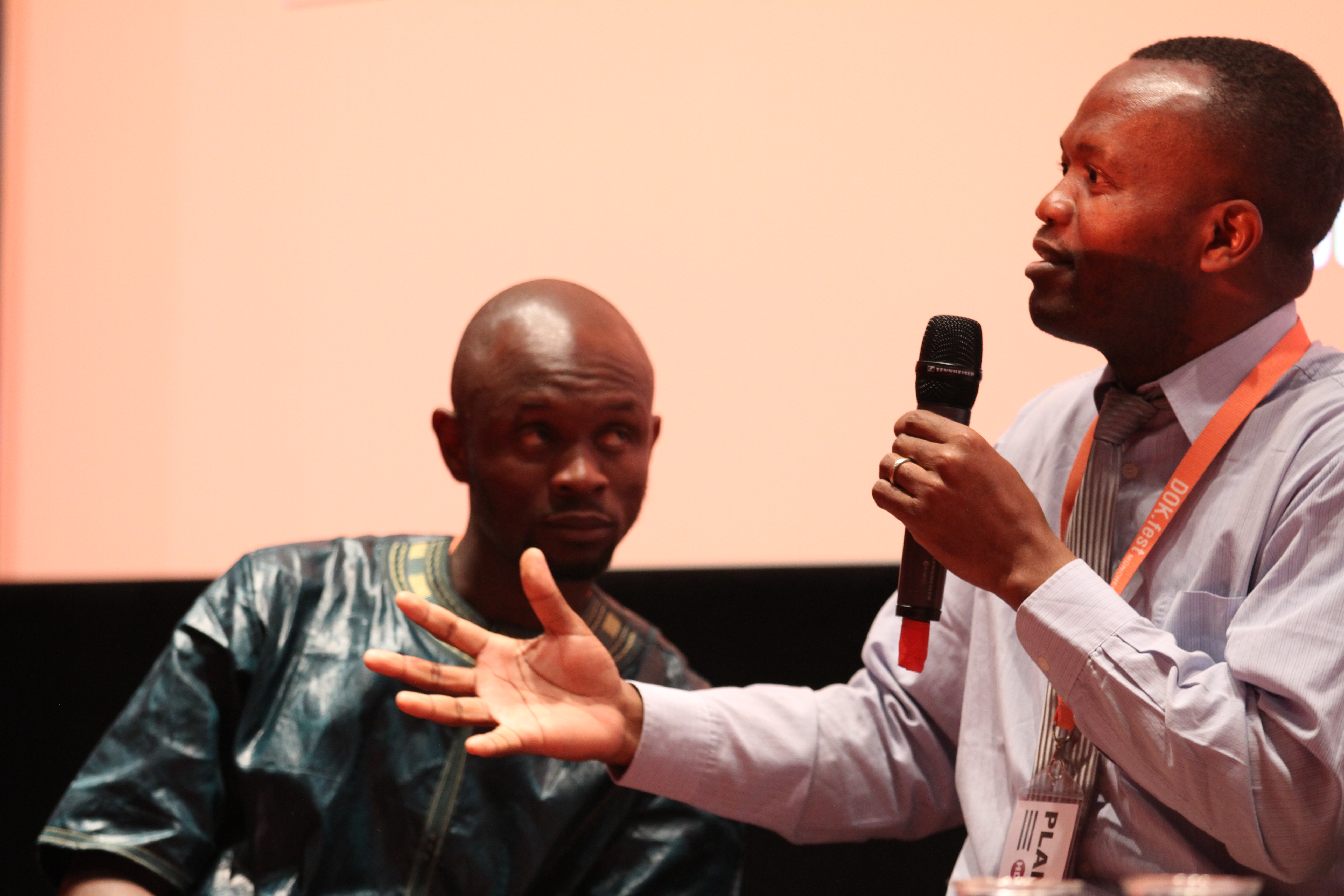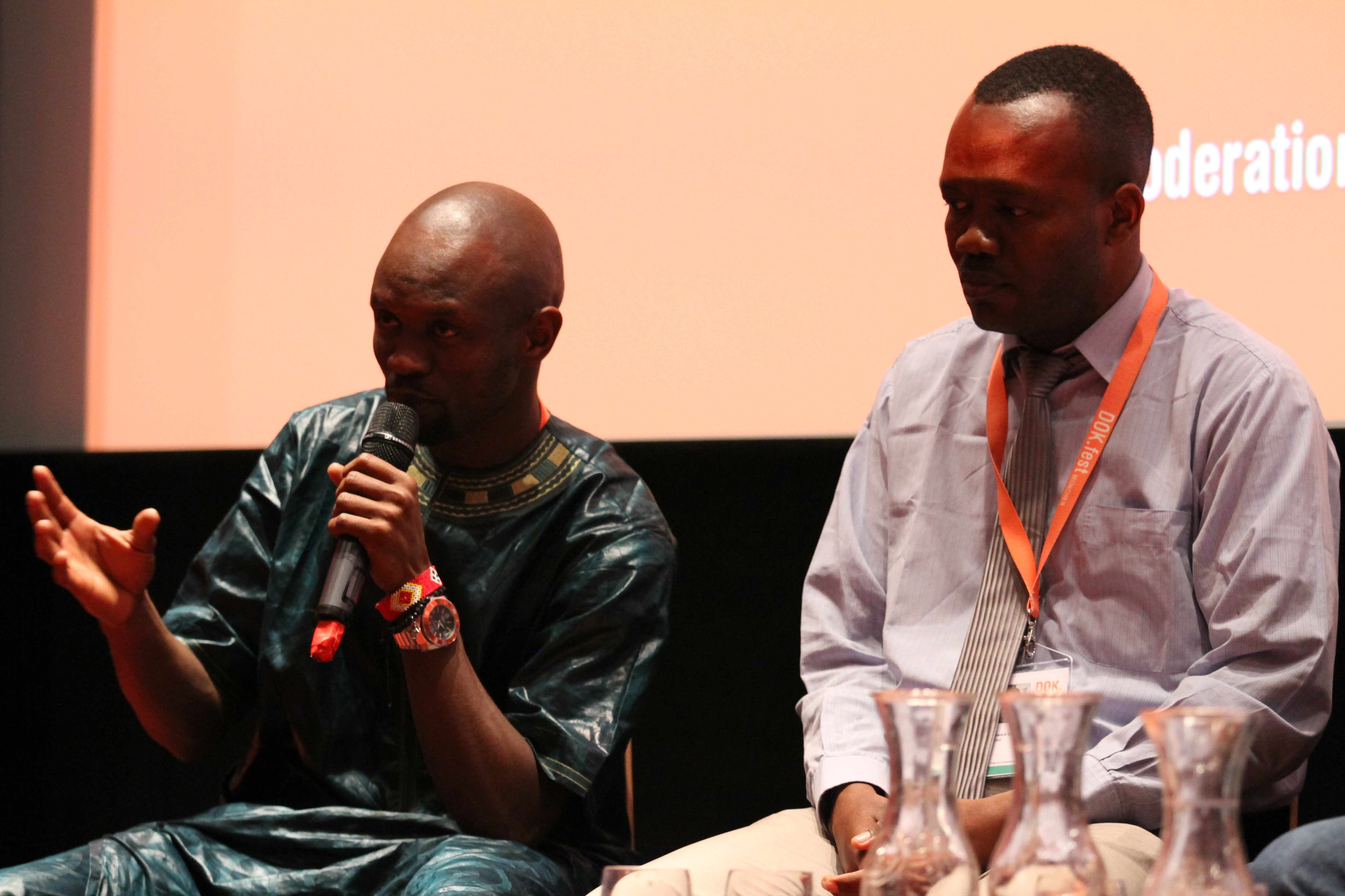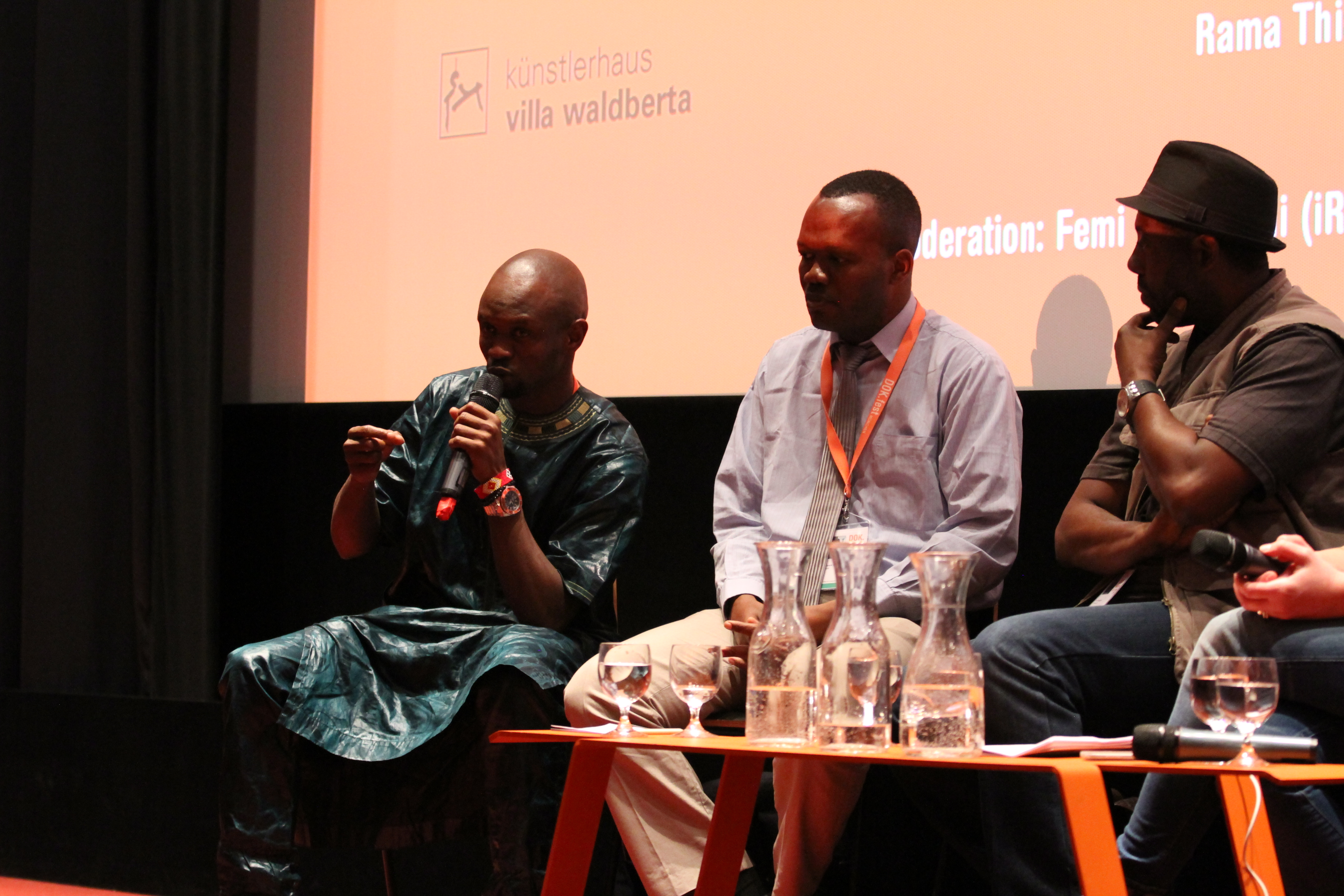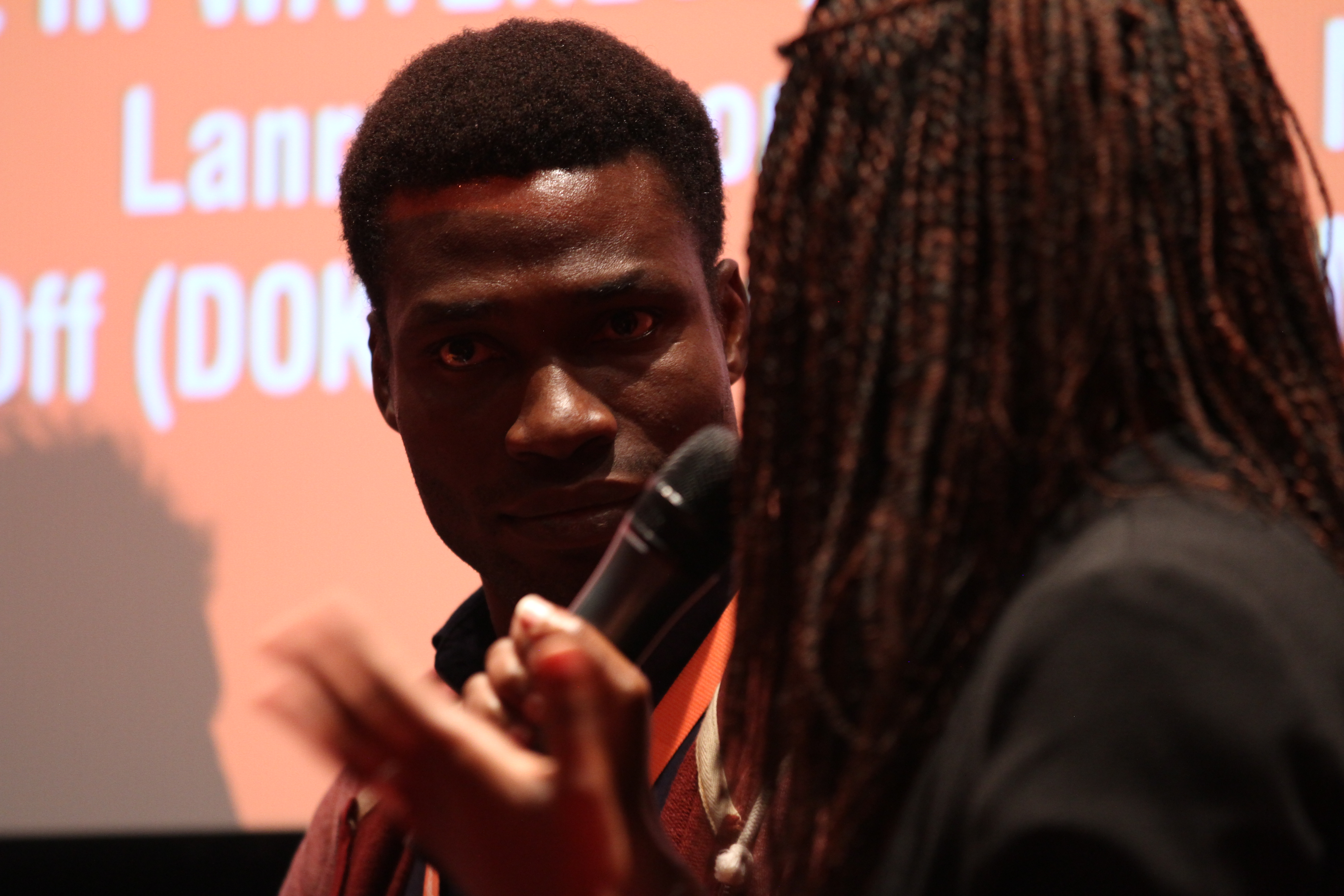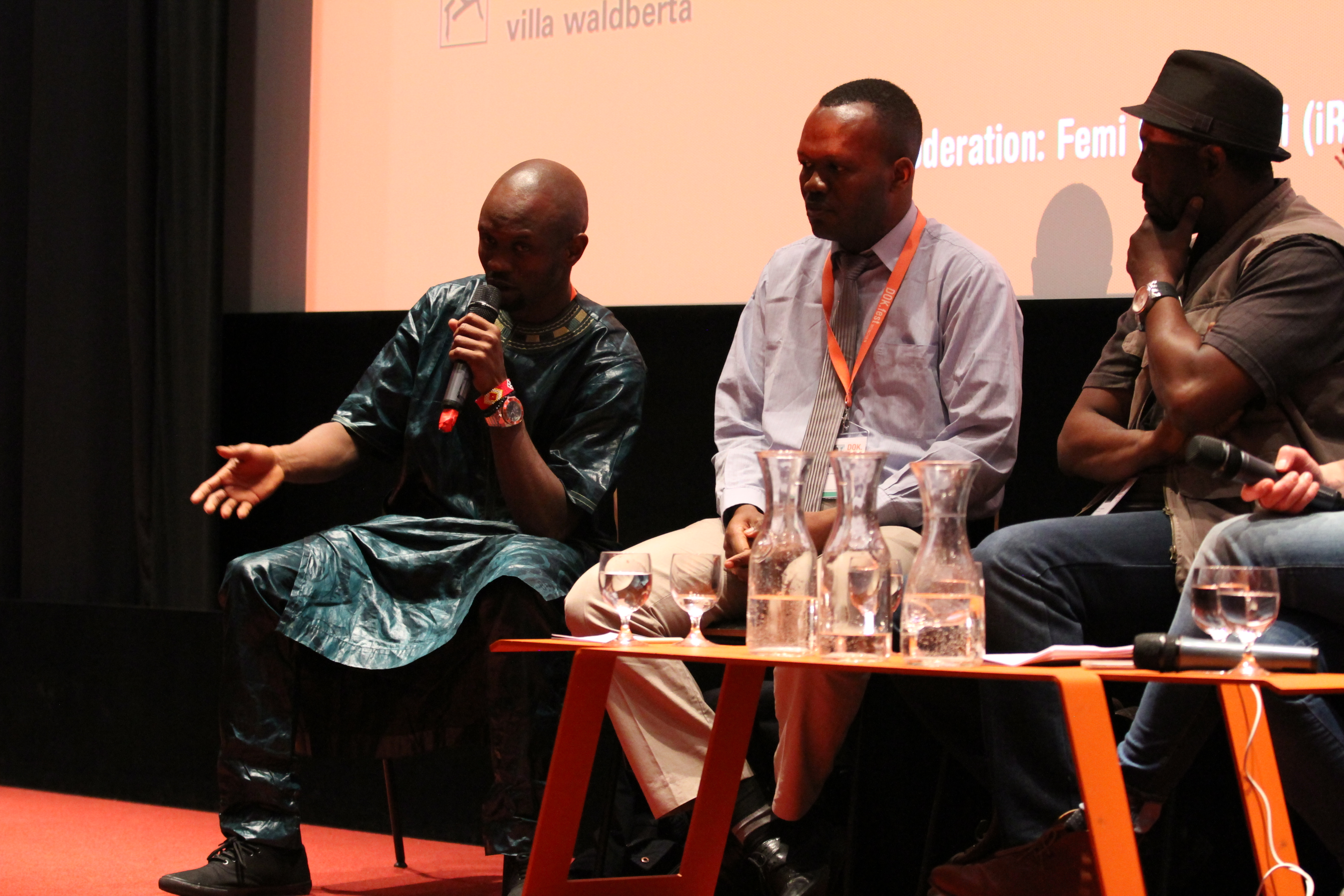 Abou Bakar Sidibé (Filmemacher und Protagonist LES SAUTEURS), Franck Otete (Protagonist EXILE IN WATERLOO), Moderator Femi Odugbemi (iREP International Documentary Film Festival Lagos) / Copyright DOK.fest – Juri Mazumdar