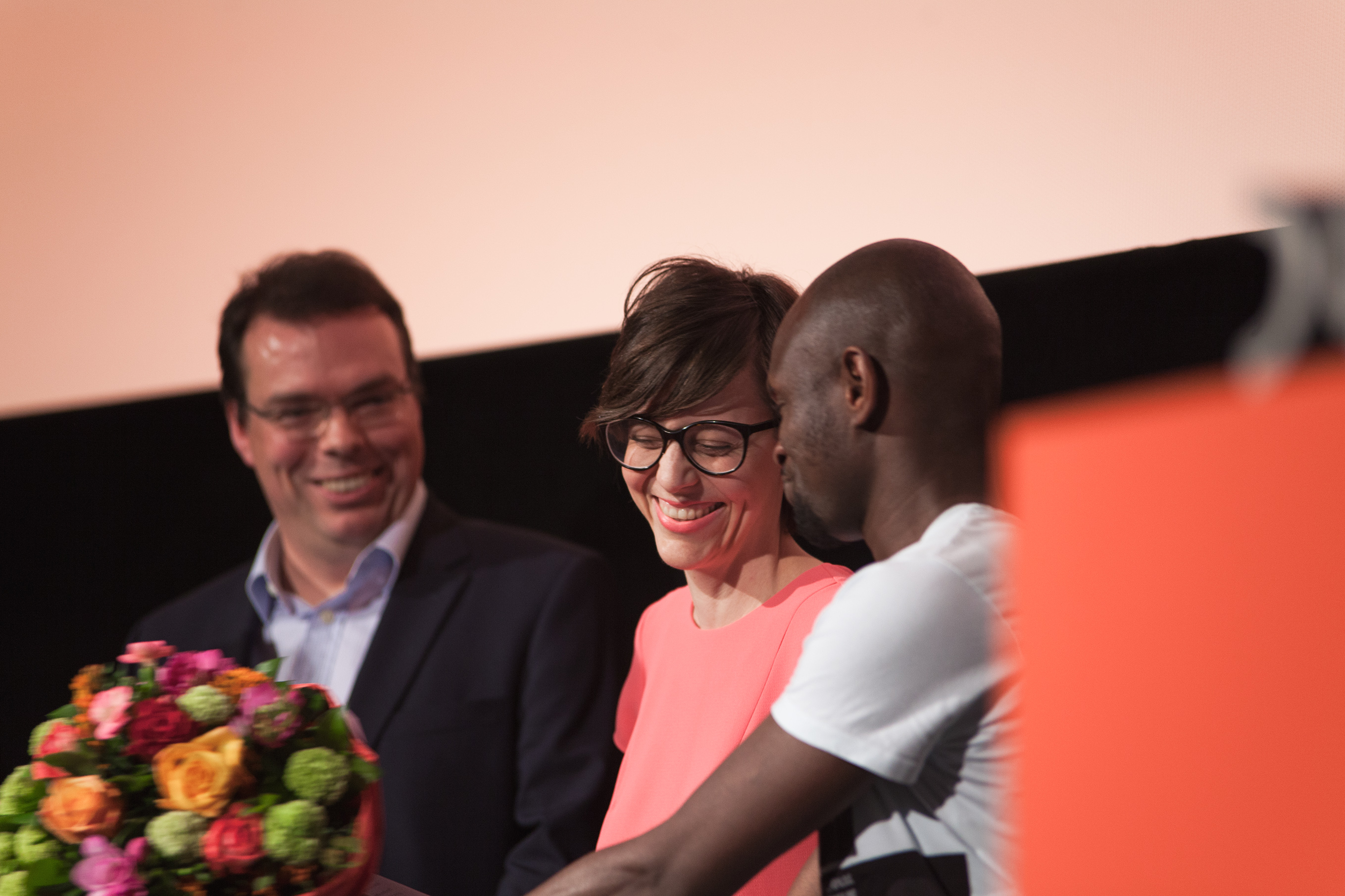 Andreas Buchner (Petra-Kelly-Stiftung), Marina May (Goethe Institut Zentrale), Abou Bakar Sidibé (Regisseur LES SAUTEURS) / Copyright DOK.fest München