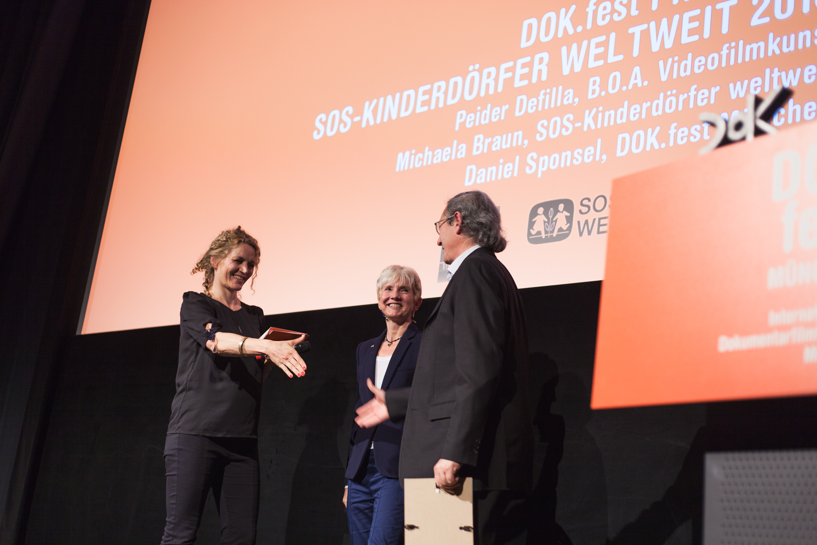 Sarah Schill (DOK.fest), Michaela Braun (SOS-Kinderdörfer weltweit), Peider Defillla (B.O.A. Videofilmkunst) / Copyright DOK.fest München