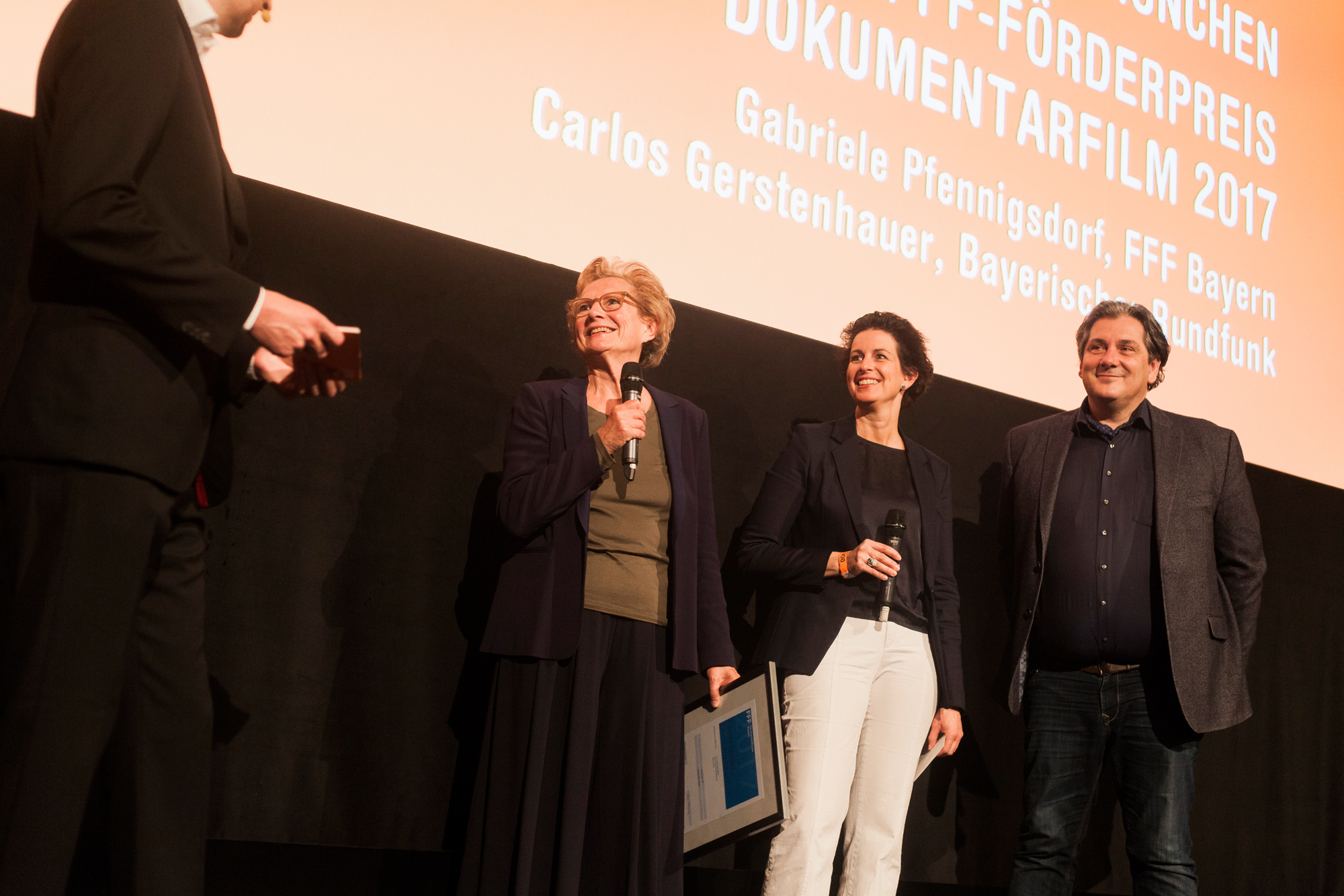 Gabriele Pfennigsdorf (FFF Bayern, Jurorin), Carmen Té (Preisträgerin FFF-Förderpreis Dokumentarfilm), Carlos Gerstenhauer (BR Kinofilm und Debüt, Juror) / Copyright: DOK.fest München