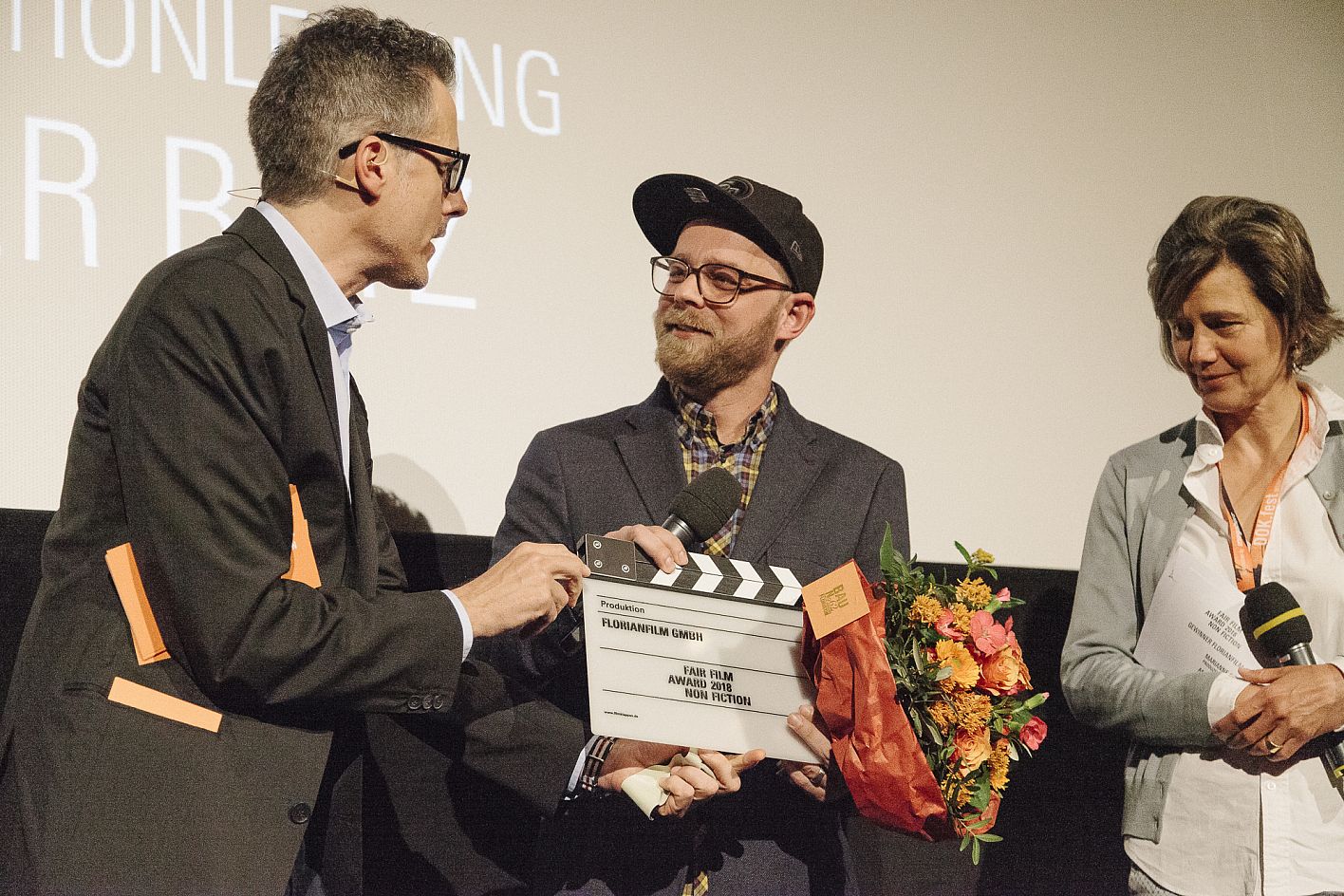 Oliver Bätz ( Florianfilm), Nicole Leykauf / Verleihung VFF Dokumentarfilm-Produktionspreis und FairFilm Award Non-Fiction / Copyright DOK.fest München 2018