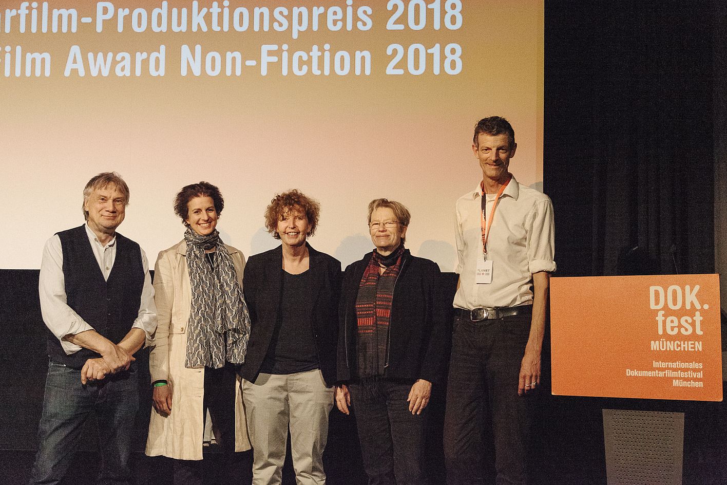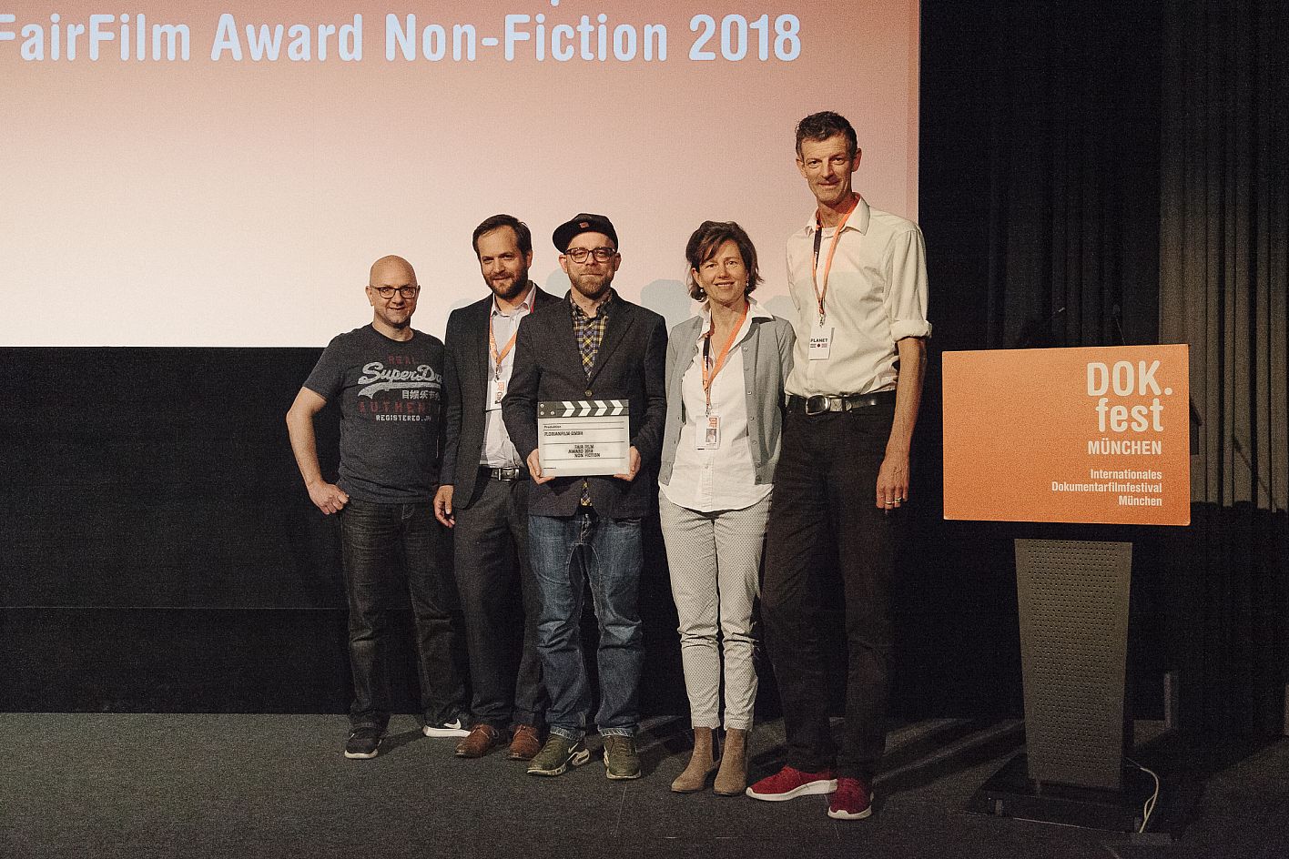 Vincent Lutz (Crew United), Oliver Bätz ( Florianfilm), Christian Dosch (Crew United), Nicole Leykauf (Leykauf Film) und Daniel Sponsel (DOK.fest) / Verleihung VFF Dokumentarfilm-Produktionspreis und FairFilm Award Non-Fiction / Copyright DOK.fest München 2018