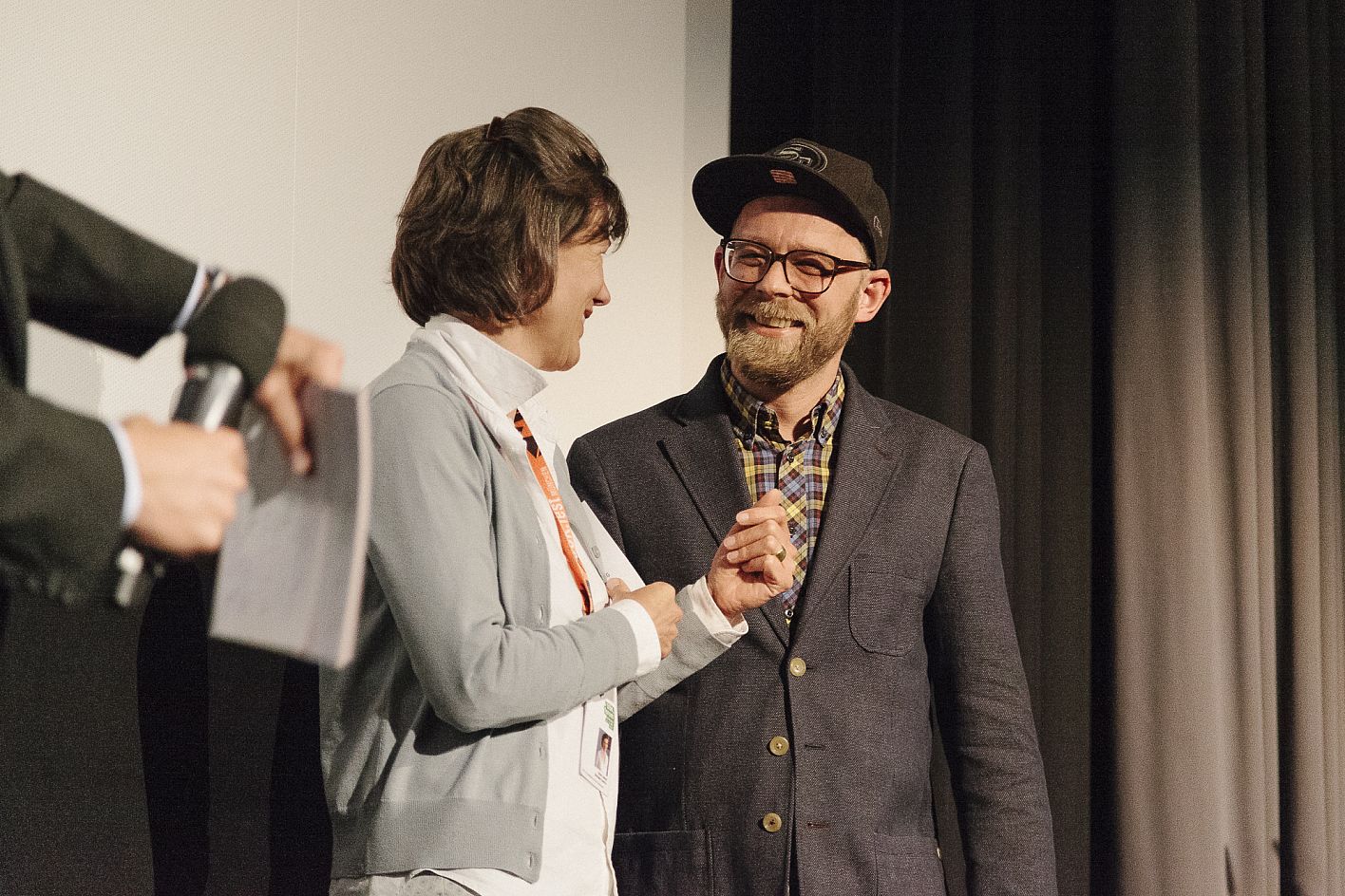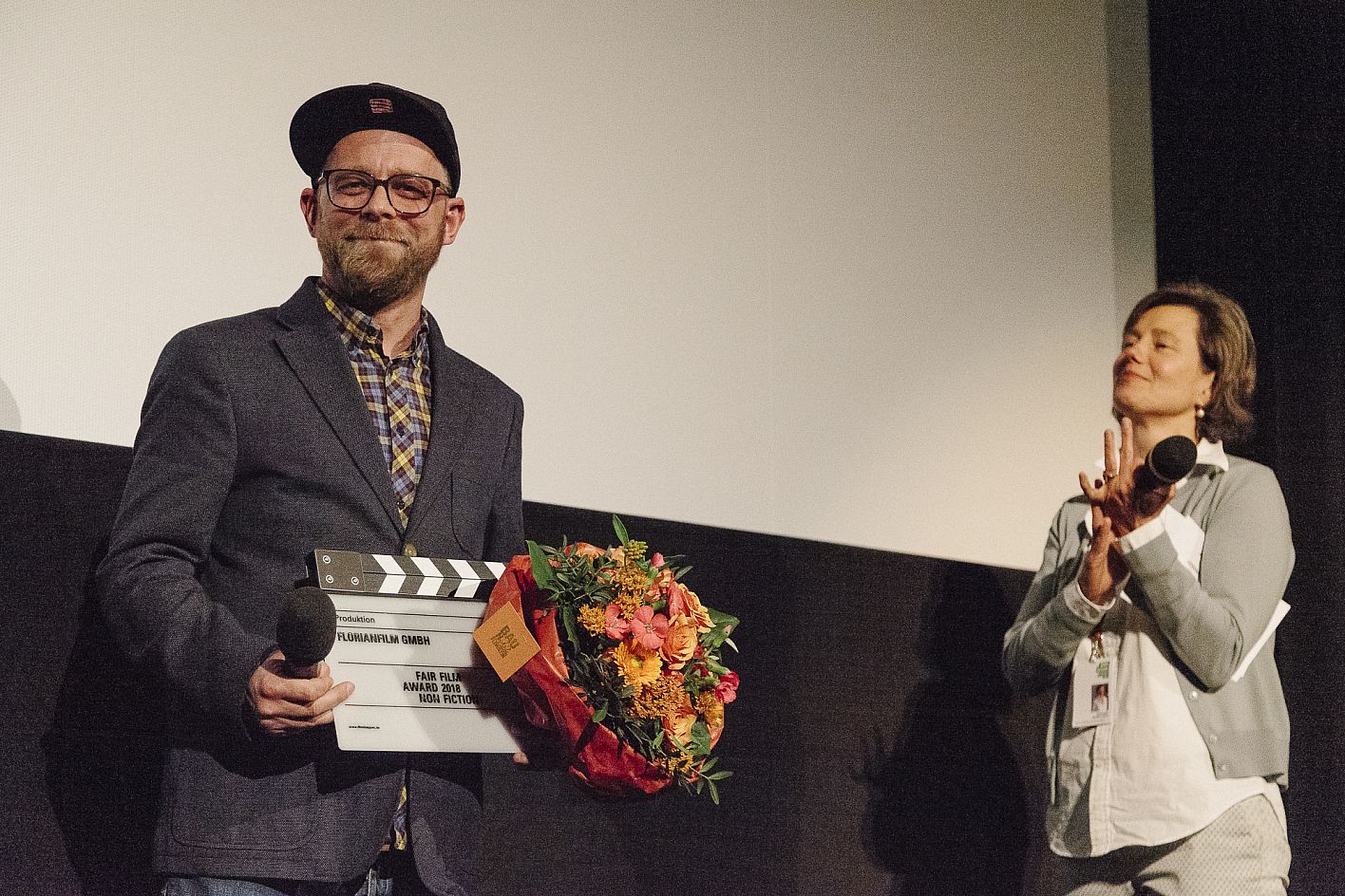 Nicole Leykauf und Preisgewinner Oliver Bätz ( Florianfilm) / Verleihung VFF Dokumentarfilm-Produktionspreis und FairFilm Award Non-Fiction / Copyright DOK.fest München 2018