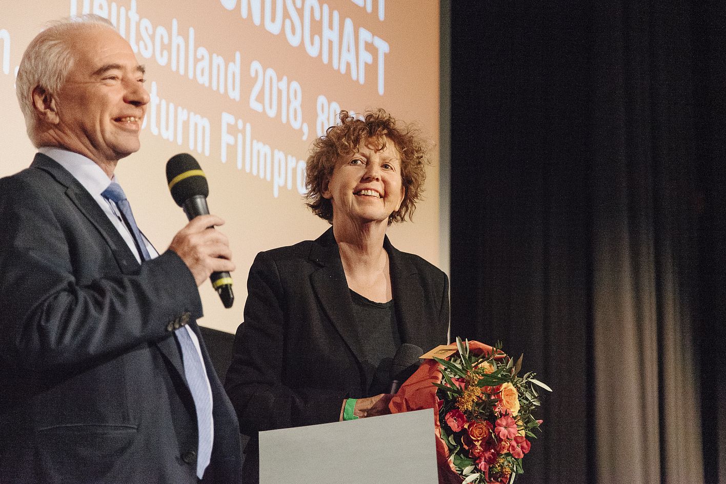 Prof. Dr. Johannes Kreile (VFF), Birgit Schulz (Preisgewinnerin) / Verleihung VFF Dokumentarfilm-Produktionspreis und FairFilm Award Non-Fiction / Copyright DOK.fest München 2018