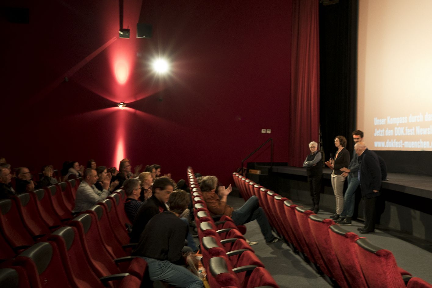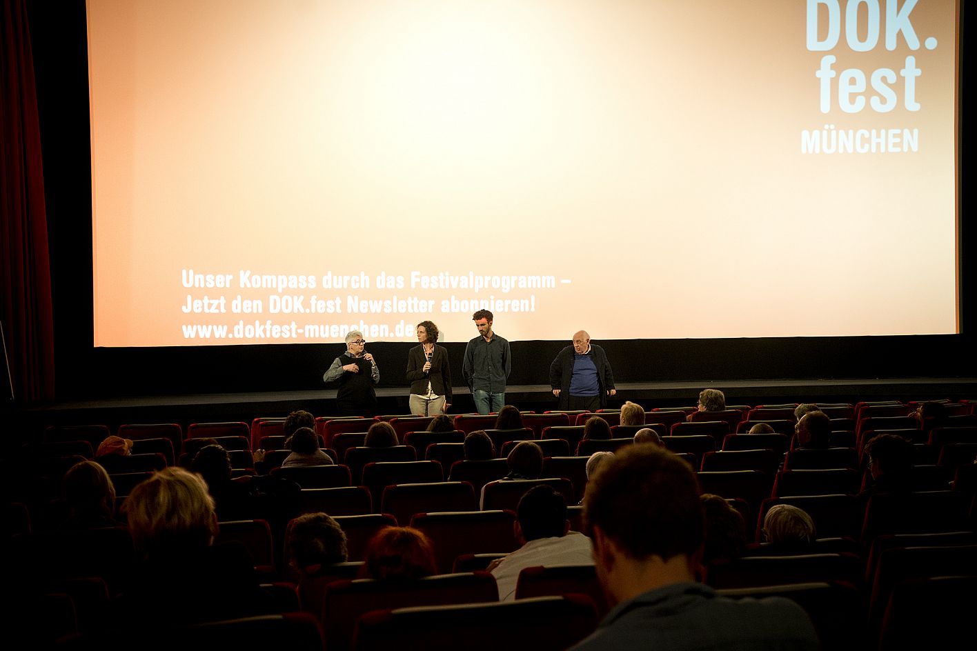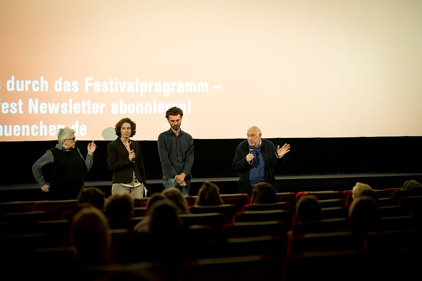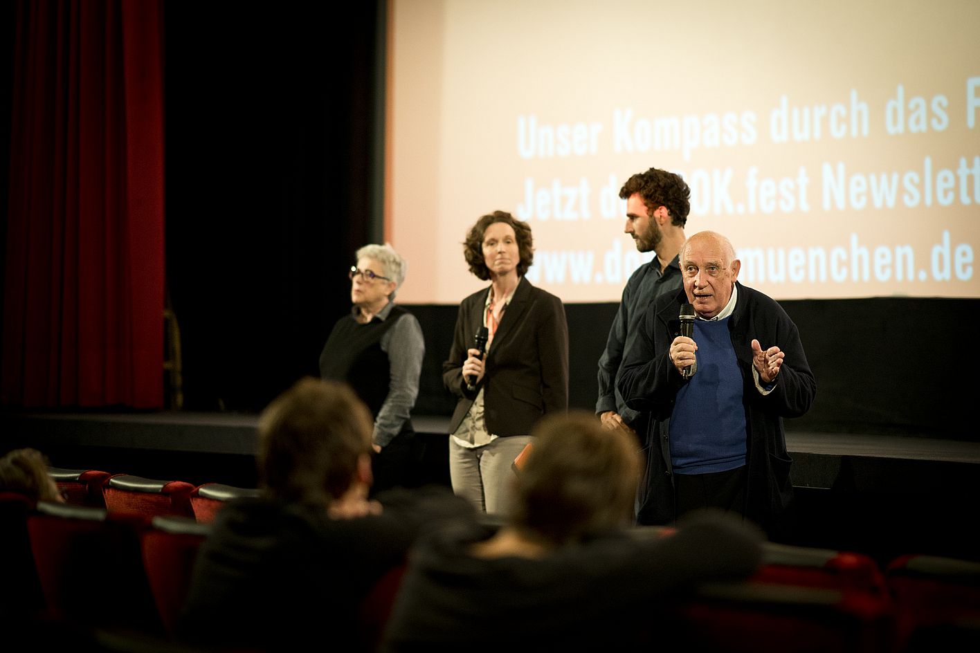 Claudine Nougaret (Produzentin 12 JOURS), Ysabel Fantou (Moderatorin DOK.fest München), Gabriel Darin (Dolmetscher DOK.fest München), Raymond Depardon (Regisseur 12 JOURS) / Copyright: DOK.fest München