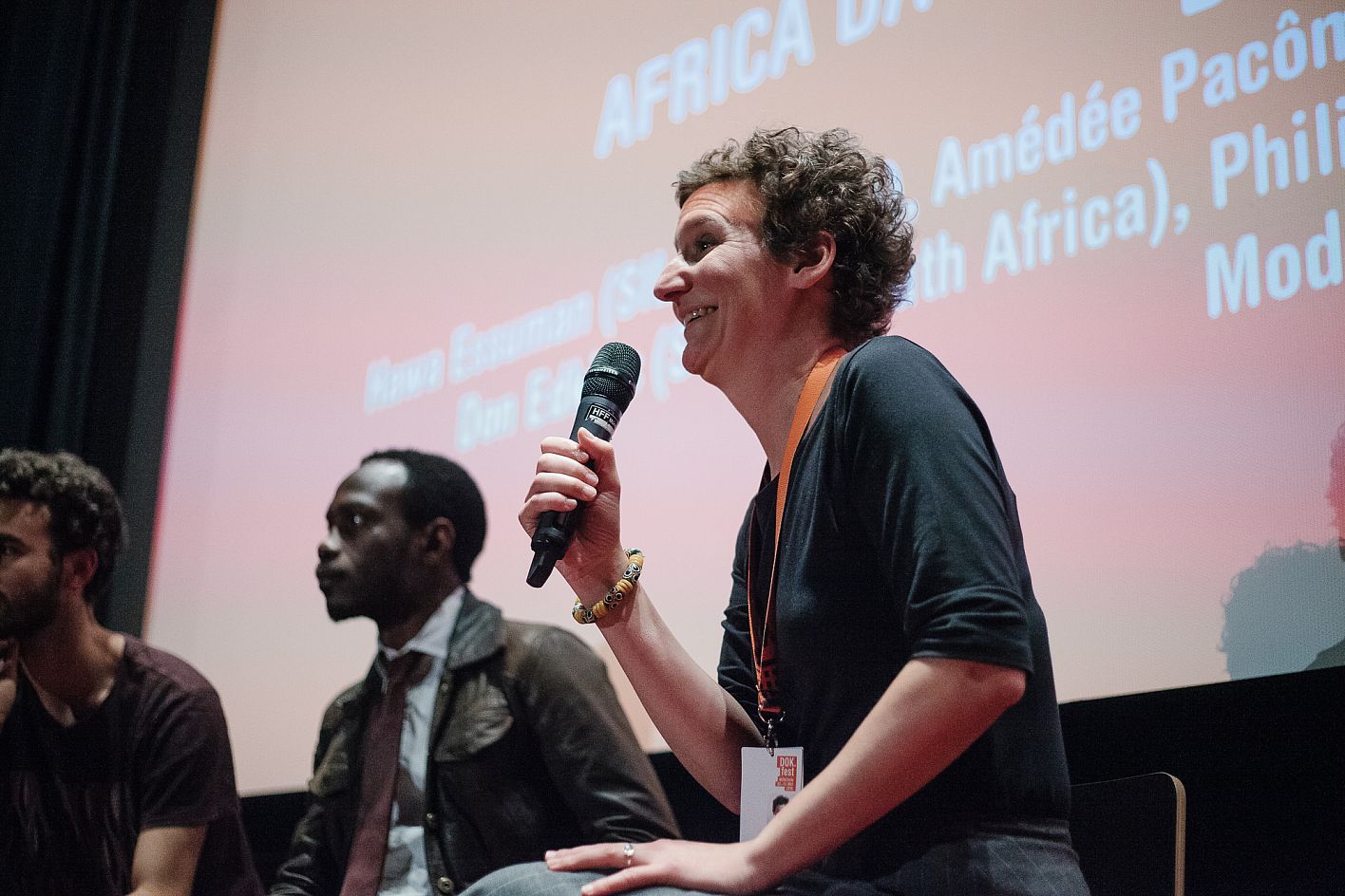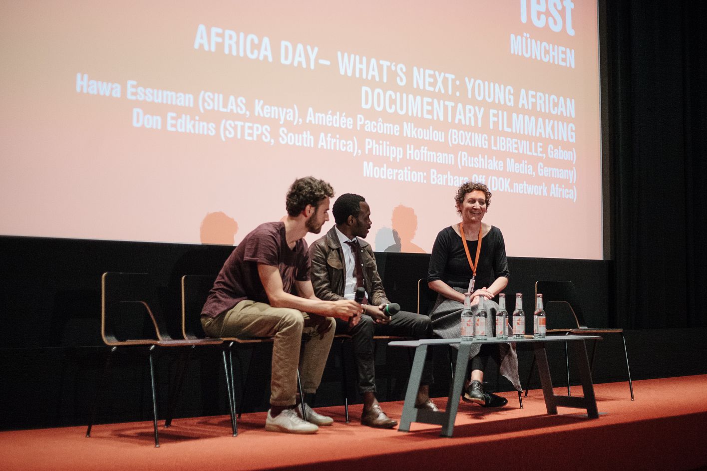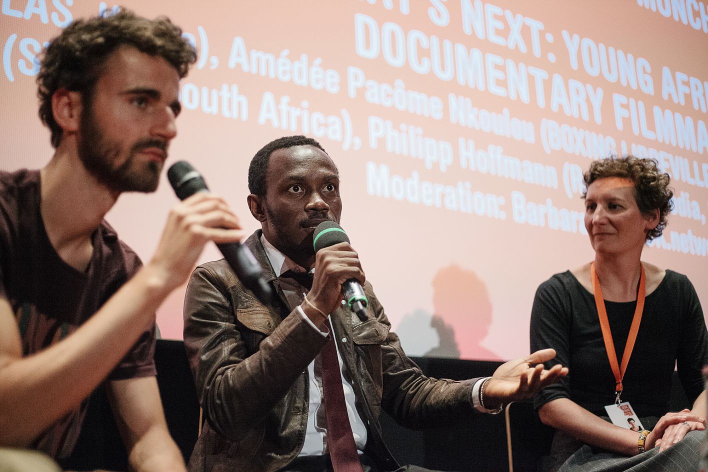 • Gabriel Darin (DOK.fest), Amédée Pacôme Nkoulou (Regie), Barbara Off (DOK.network Africa) / Copyright DOK.fest München