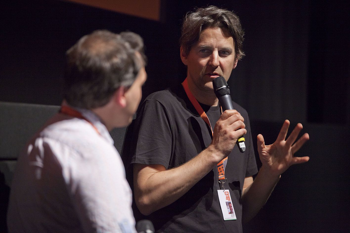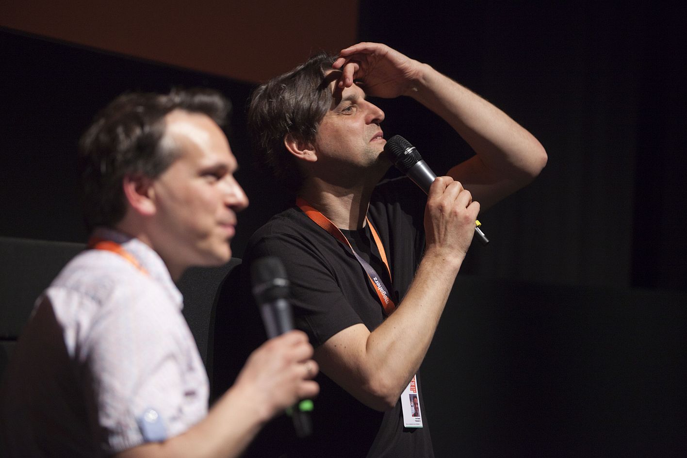 • Simon Hauck (Moderator DOK.fest München), Bart Simpson (Regisseur) / Copyright: DOK.fest München