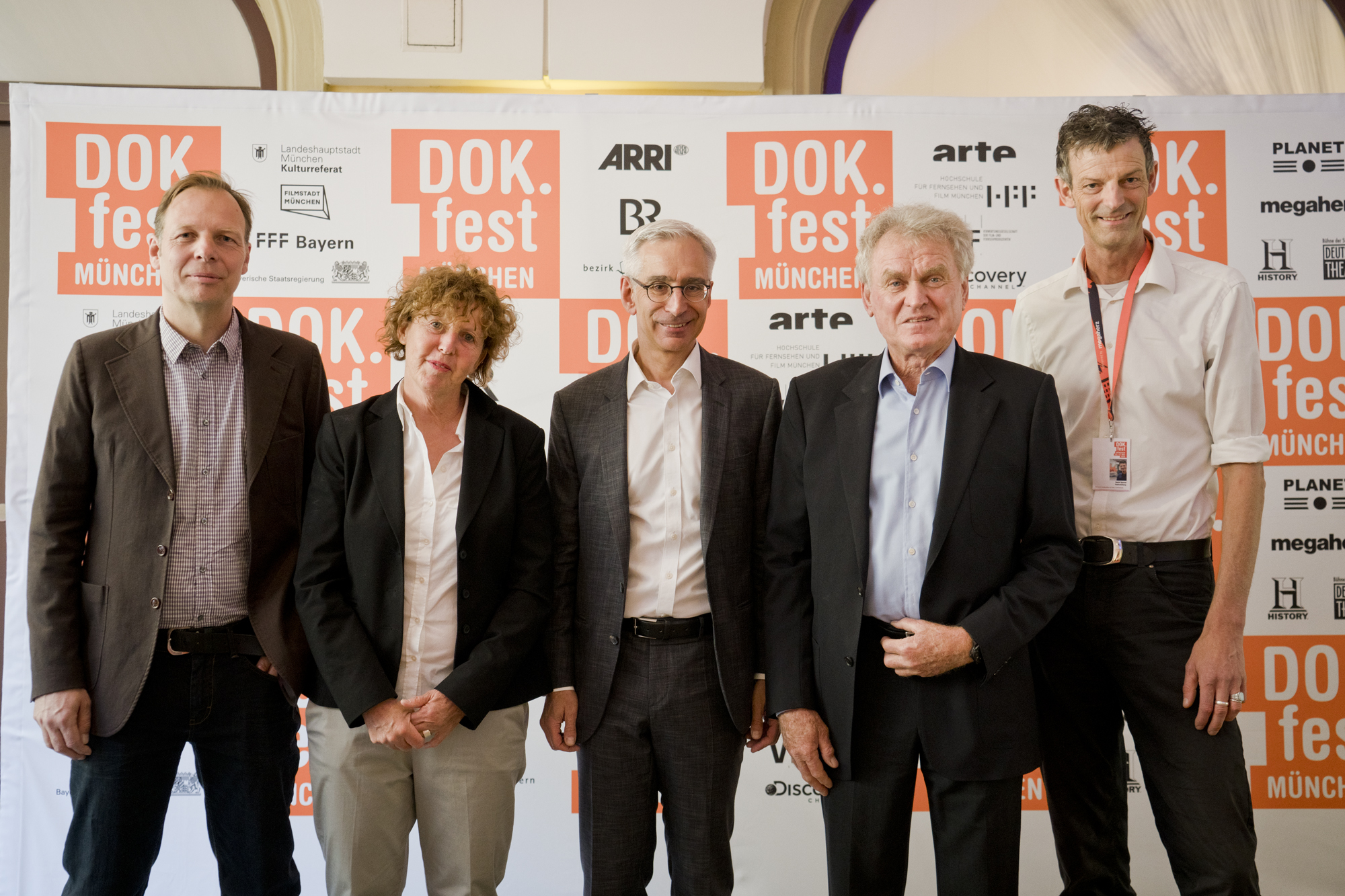 • Gerhard Schick (Regisseur), Birgit Schulz (Produzentin), Dr. Reinhard Scolik (Bayerischer Rundfunk), Sepp Maier (Protagonist), Daniel Sponsel (Festivalleiter) / Copyright: DOK.fest München