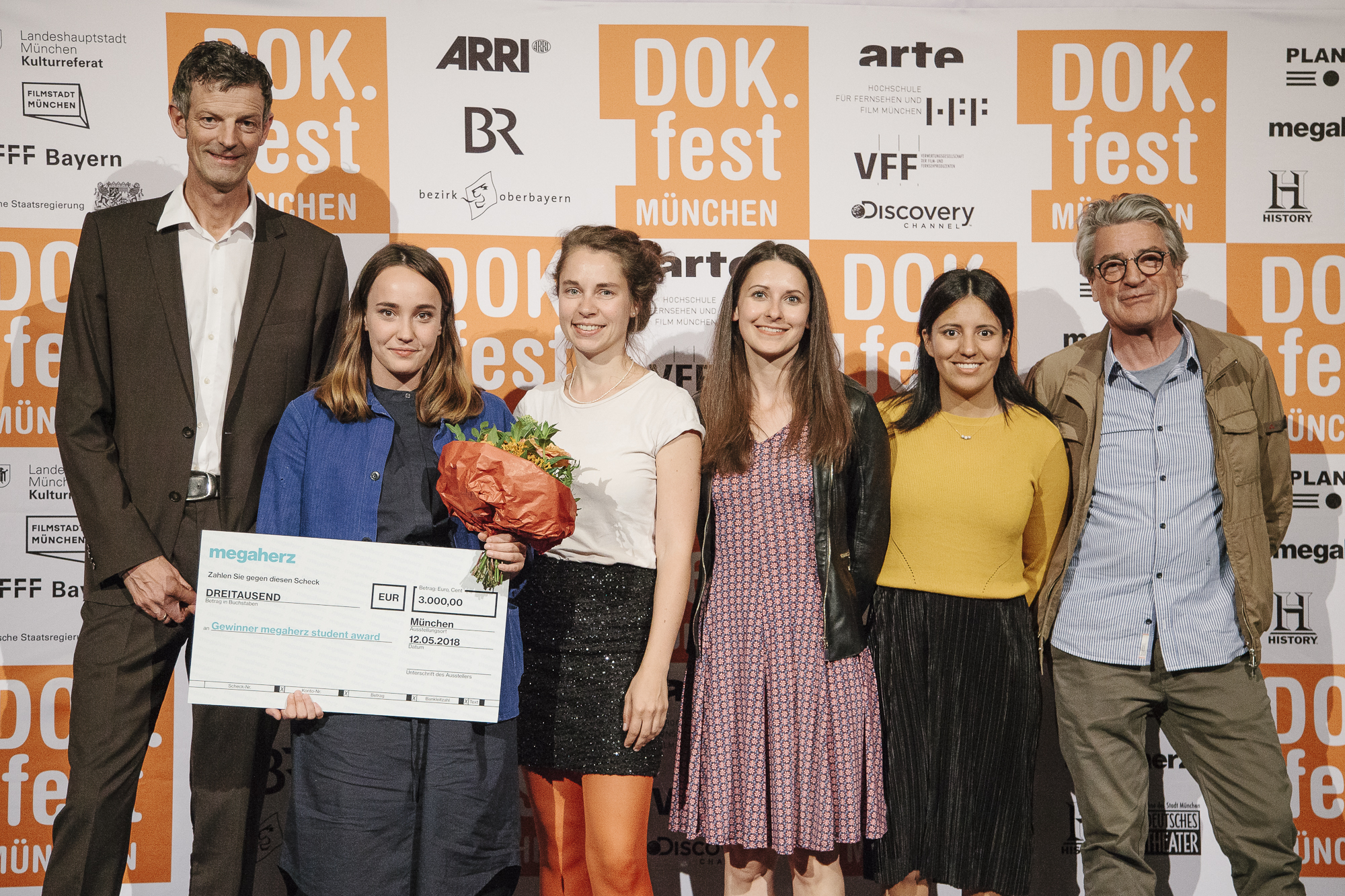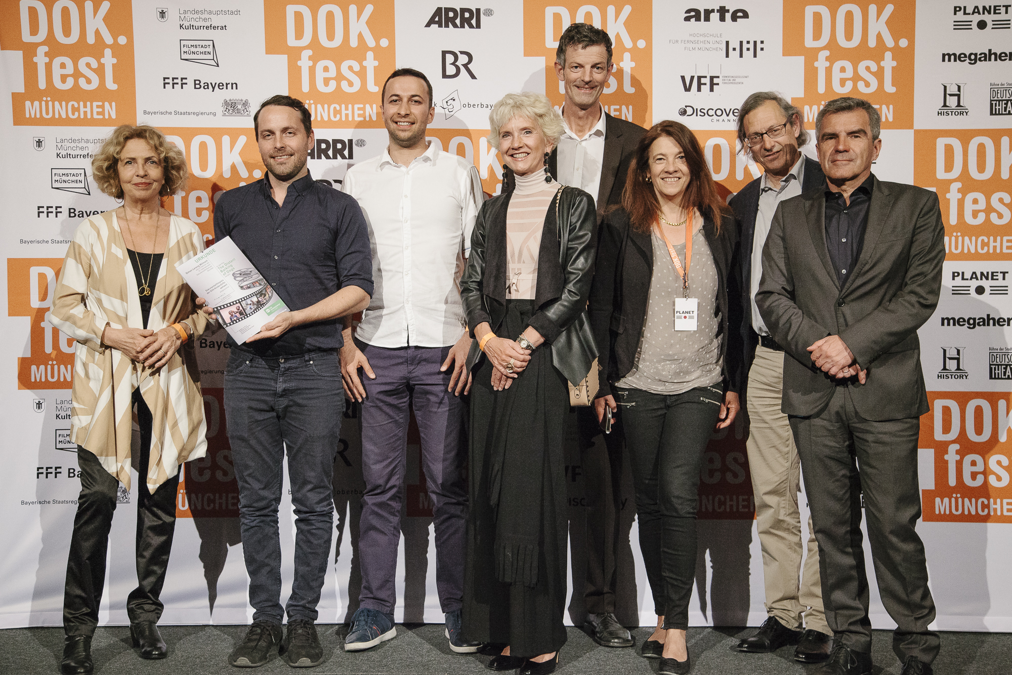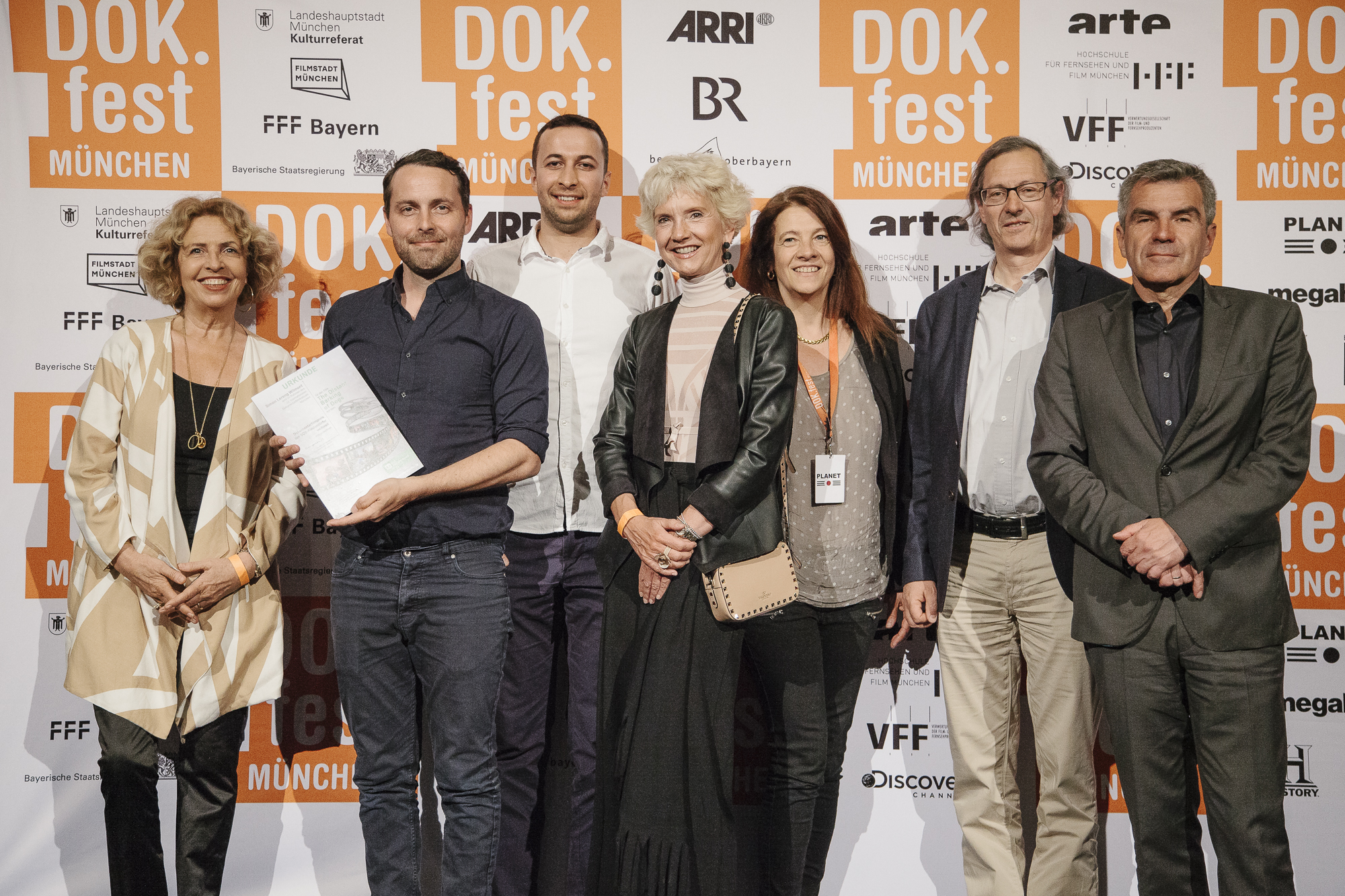 Michaela May (Jurorin DOK.fest Preis der SOS-Kinderdörfer weltweit), Simon Lereng Wilmont (Preisträger VIKTOR Main Competition DOK.international), Azad Safarov (Co-Regisseur THE DISTANT BARKING OF DOGS), Michaela Braun (stellvertretende Aufsichtsratsvorsitzende SOS-Kinderdörfer weltweit), Christine Kehrer (SOS-Kinderdörfer weltweit), Peider Defilla (B.O.A. Videofilmkunst), Hans Demmel (Juror DOK.fest Preis der SOS-Kinderdörfer weltweit) / Copyright: DOK.fest München