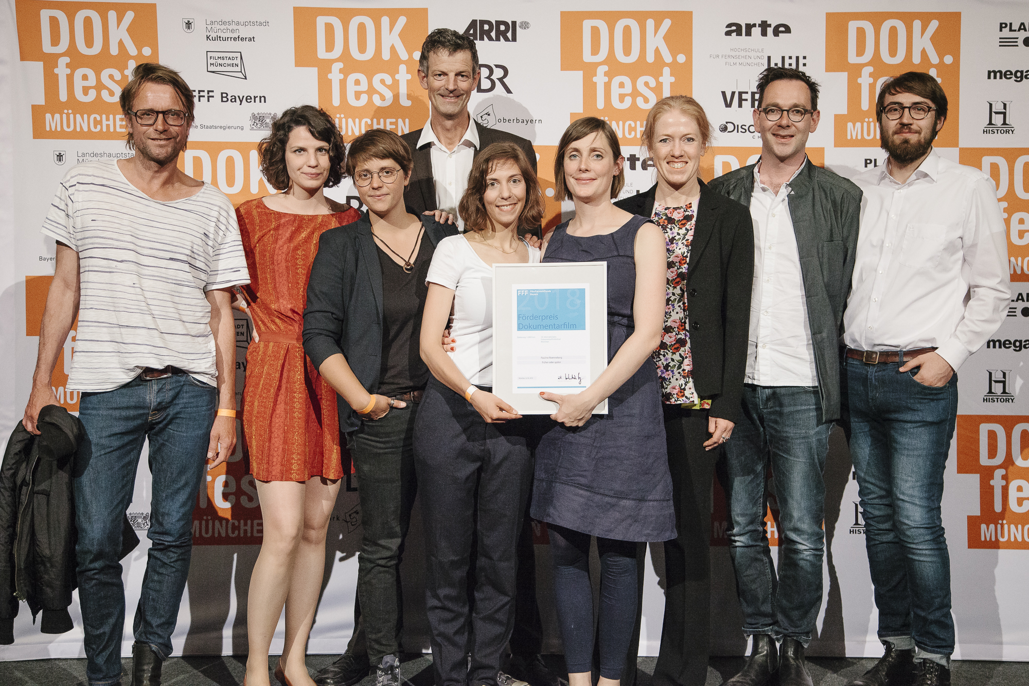 Matthias Leybrand (Bayerischer Rundfunk), Britta Schwem (Ton FRÜHER ODER SPÄTER), Zoe Schmederer (Kamera FRÜHER ODER SPÄTER), Daniel Sponsel (Festivalleiter), Isabelle Bertolone (Produzentin FRÜHER ODER SPÄTER), Pauline Roenneberg (Preisträgerin FFF Förderpreis Dokumentarfilm), Barbara Bauer (Jurorin FFF Förderpreis Dokumentarfilm), Sebastian Sorg (FFF Bayern) / Copyright: DOK.fest München