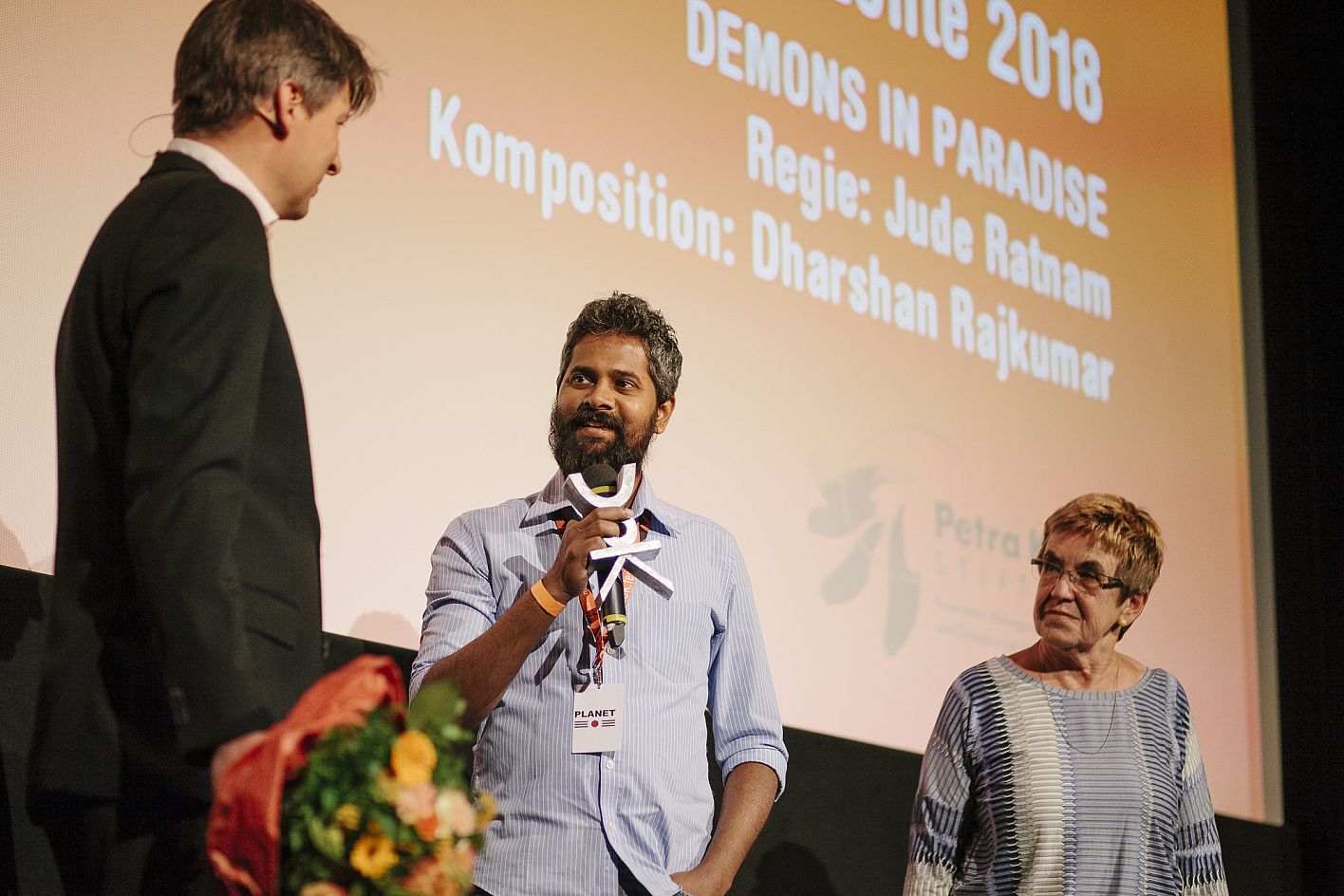 • Renate Grasse (Petra-Kelly-Stiftung), Dharshan Rajkumar (Komponist DEMONS IN PARADISE), Daniel Sponsel (Festivalleiter) / Copyright: DOK.fest München