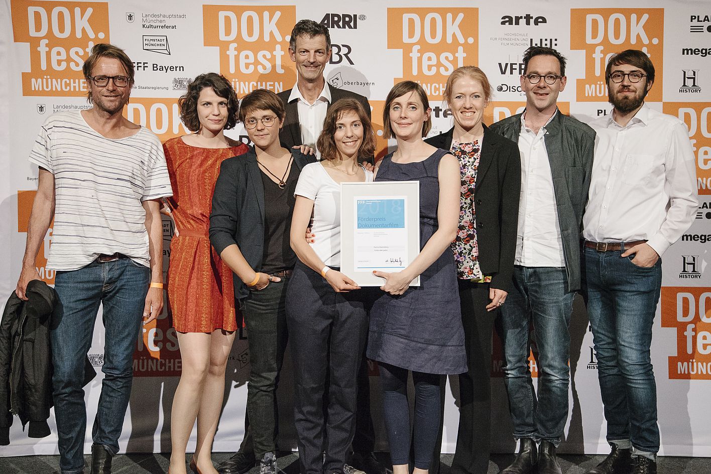 • Matthias Leybrand (Bayerischer Rundfunk), Britta Schwem (Ton FRÜHER ODER SPÄTER), Zoe Schmederer (Kamera FRÜHER ODER SPÄTER), Daniel Sponsel (Festivalleiter), Isabelle Bertolone (Produzentin FRÜHER ODER SPÄTER), Pauline Roenneberg (Preisträgerin FFF Förderpreis Dokumentarfilm), Barbara Bauer (Jurorin FFF Förderpreis Dokumentarfilm), Sebastian Sorg (FFF Bayern) / Copyright: DOK.fest München