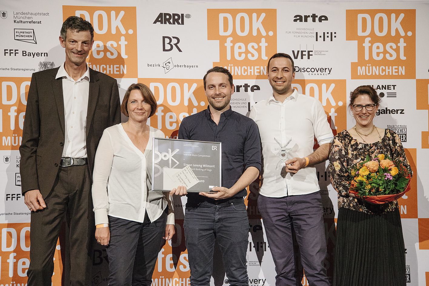 • Michaela May (Jurorin DOK.fest Preis der SOS-Kinderdörfer weltweit), Simon Lereng Wilmont (Preisträger VIKTOR Main Competition DOK.international), Azad Safarov (Co-Regisseur THE DISTANT BARKING OF DOGS), Michaela Braun (stellvertretende Aufsichtsratsvorsitzende SOS-Kinderdörfer weltweit), Christine Kehrer (SOS-Kinderdörfer weltweit), Peider Defilla (B.O.A. Videofilmkunst), Hans Demmel (Juror DOK.fest Preis der SOS-Kinderdörfer weltweit) / Copyright: DOK.fest München