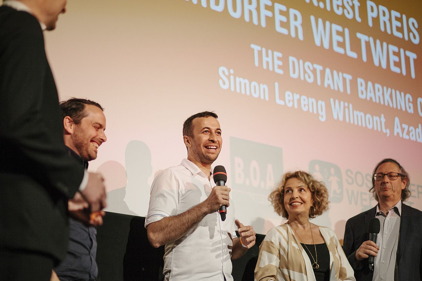 • Simon Lereng Wilmont (Regie THE DISTANT BARKING OF DOGS), Azad Safarov (Produzent THE DISTANT BARKING OF DOGS), Michaela May (Jury DOK.fest-Preis der SOS Kinderdörfer weltweit, Schauspielerin), Peider Defilla (B.O.A. Filmkunst) / Copyright DOK.fest München