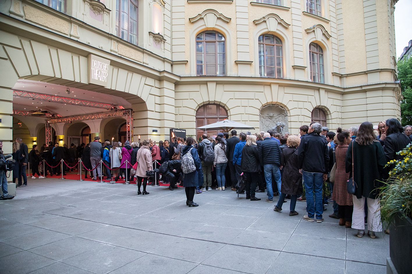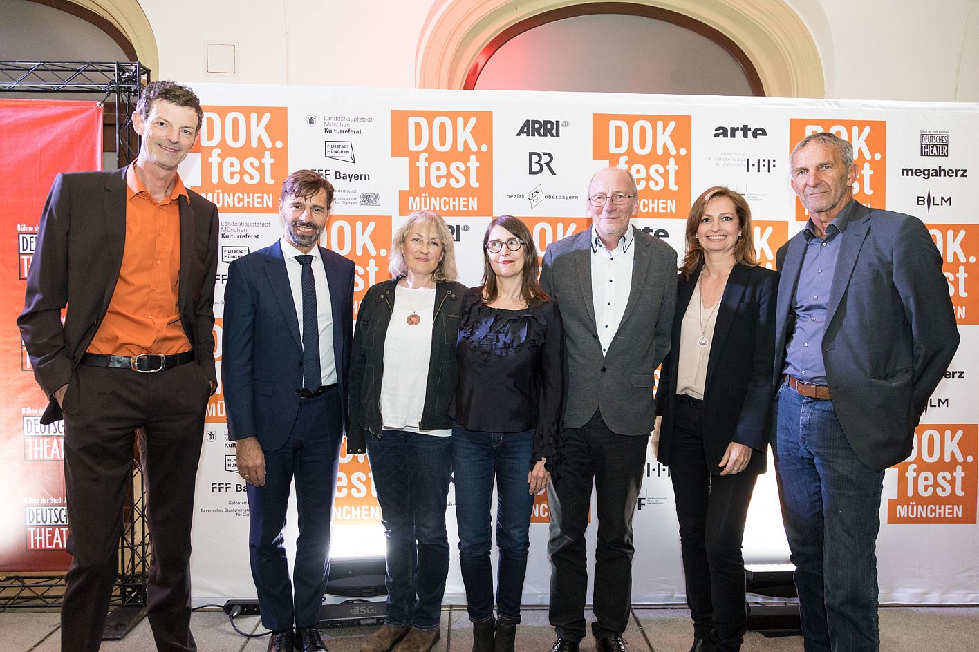 Eröffnung DOK.fest München / Daniel Sponsel (Leiter DOK.fest München), Dr. Hans Michael Strepp (Amtschef im Bayerischen Staatsministerium für Digitales), Janie Wray (Protagonistin), Mirjam Leuze (Regisseurin), Dr. Hans-Georg Küppers (Kulturreferent der Landeshauptstadt München), Carmen Bayer und Werner Steer (Geschäftsführer Deutsches Theater), Copyright: DOK.fest München